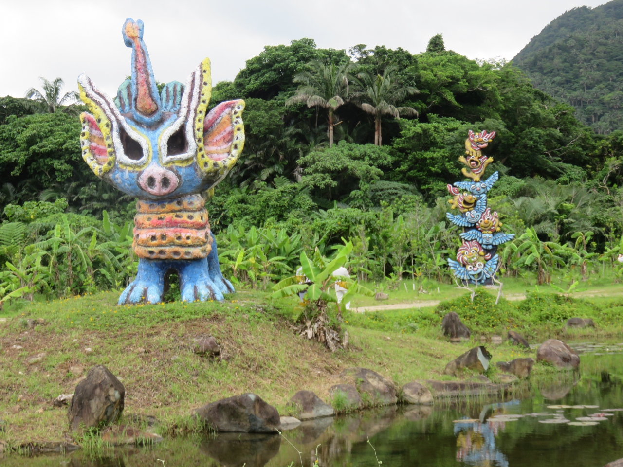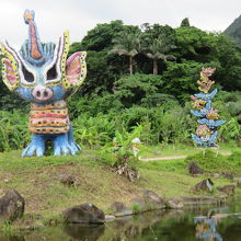 ツアーで立ち寄りました。シーサー農園というところには巨大なシーサーがあちこちに立っていてユニークで面白いです。人の背丈の何倍もあるようなものや宇宙人のような顔のものなど見ていて飽きません。池があってその周りにおいてあったり、椅子の形に作ってあって座れたりします。園内にバナナの木があって花が咲いて実がなっていました。南国だな~と思いました。