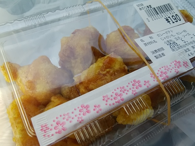 「カレーポテト」190円(税込)です。さっそく車の中で食べてみるー!冷めているんだけど、じゃがいもを衣をつけて揚げて、カレーのソースにくぐらせてある。カレーもじゃがいもも好きだから、うまくないわけがない、そんな一品でした!
