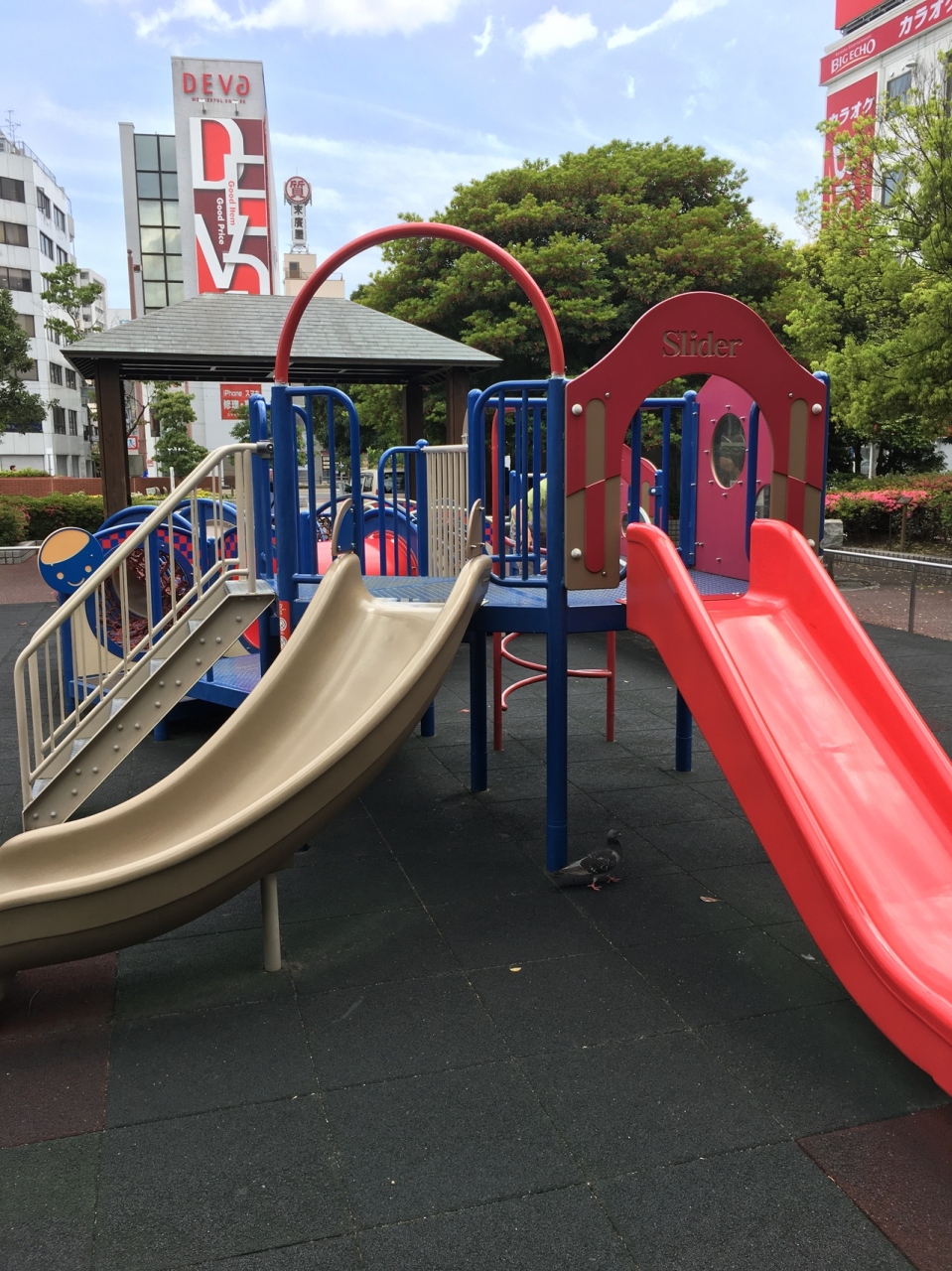 ひろめ市場とはりまや橋のちょうど中間地点にある公園で、どちらにもアーケード街を歩いて行くことができる便利な場所にあります。地下が駐車場になっており、我が家はそこに車を停めて観光しました。平日だったので公園の広場はガランとしていましたが、ちょっとした遊具があり、ドライブに退屈した子供のストレス発散に役立ちました!