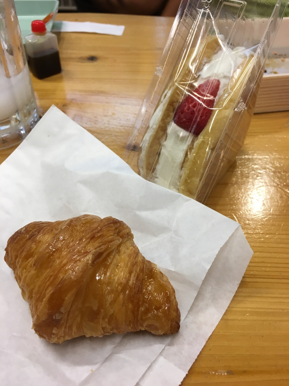 高知旅行でひろめ市場でランチ。カツオのたたきなど、いろいろ名物をいただき、最後はデザート!とってもおいしそうないちごワッフルと目が合いました笑。高知名物の土佐ジローの卵を使ったミニクロワッサンも売っていたので、一緒に購入。ワッフルはほとんど息子に食べられ、あっという間になくなりました~!クロワッサンは正直土佐ジローかは分かりませんが、観光客的には名物を食べたという思い出によいかと思います。どちらもおいしかったです!