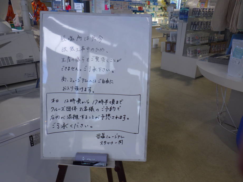 最終日、飛行機が出る前の時間を使って雪塩製塩所を訪れました。しかし、改修工事中ということで、生産の様子は見られず、ショップとミュージアムしか見られませんでした。ショップは他のエリアで見たことがあったので、やはり生産の様子がみたかったです。