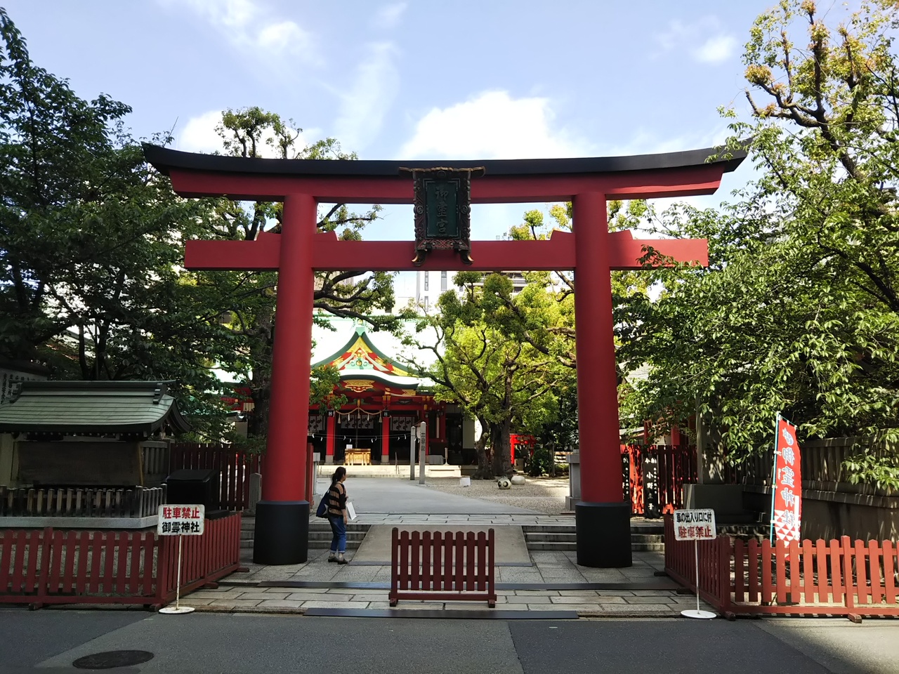 境内は雑居ビルに囲まれていますが、静かな場所にあり、朱色の鳥居、本殿は落ち着いた雰囲気となっています。