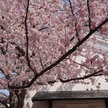 中庭にでると桜が満開できれいでした。奥にはこちらで経営されている「レストランさくら」がありました。