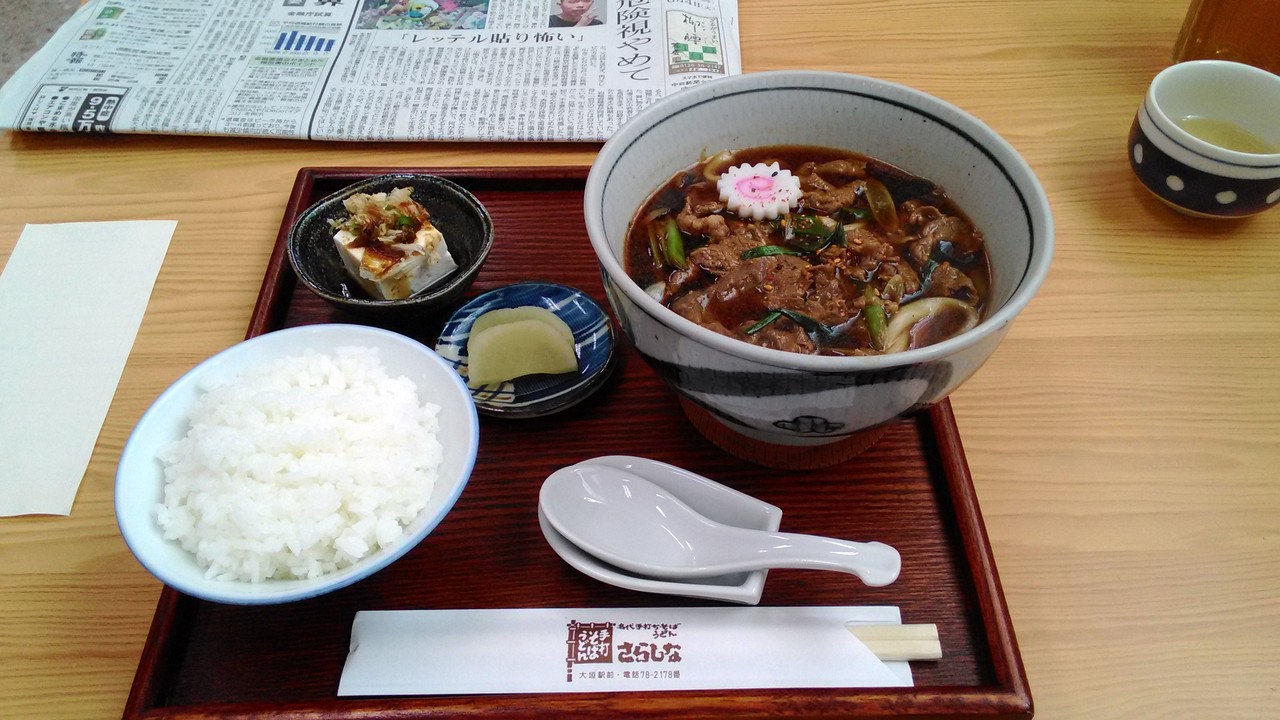 大垣駅前、飛騨牛肉うどんが名物の老舗店らしいです。店前に有名B級グルメ的なポスターが掲示されていたのでランチ時に利用しました。