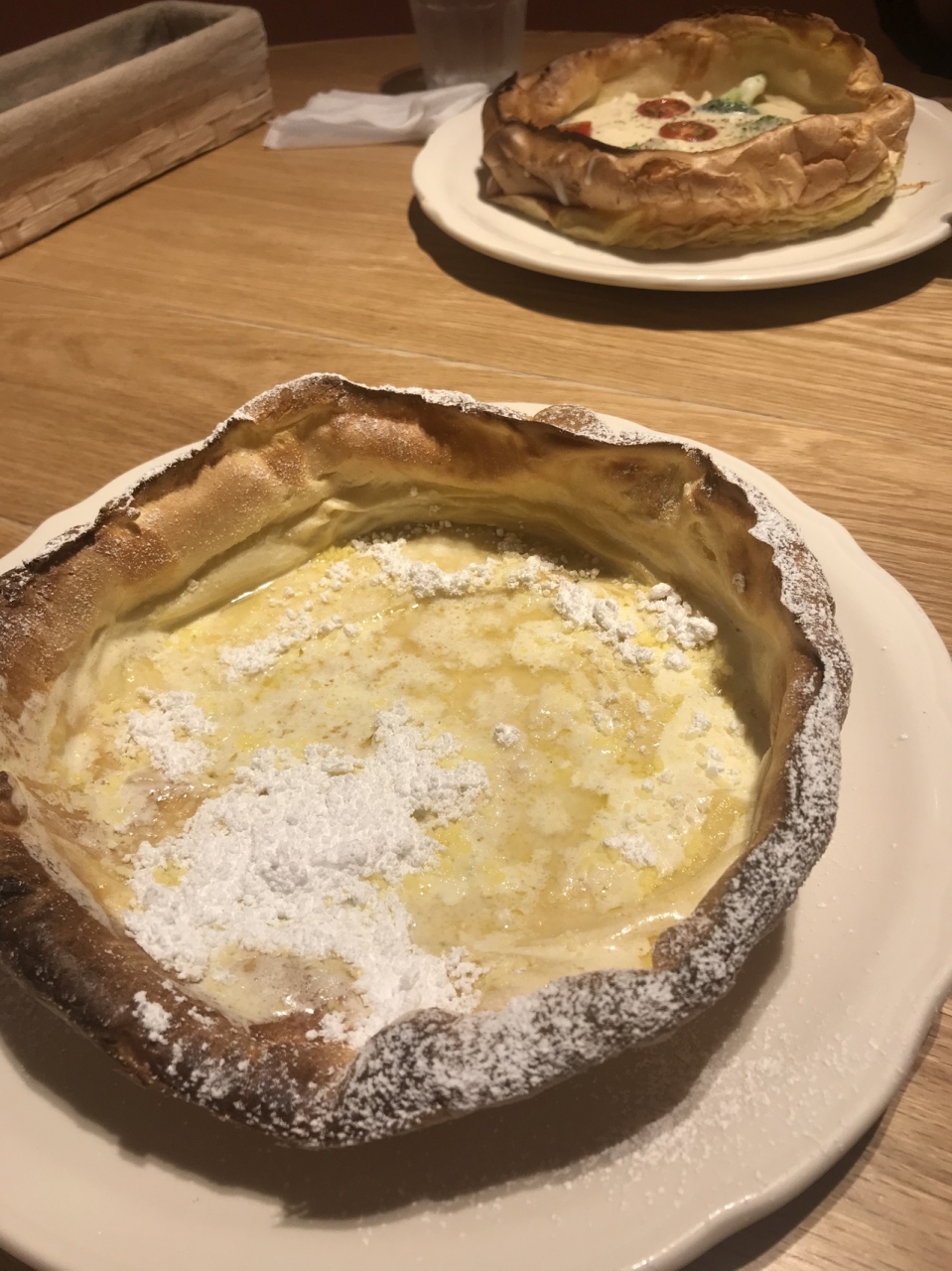 ダッチベイビーが看板商品のオリジナルパンケーキハウスさんです。クレープのような食感の生地にレモンバターにレモンの果実をしばり、最後に粉糖をたっぷりとあるかけて仕上げます。味が単調なので、途中で飽きちゃいました。