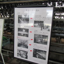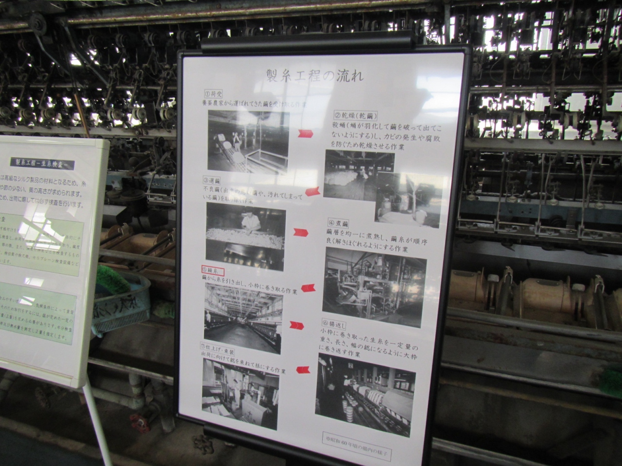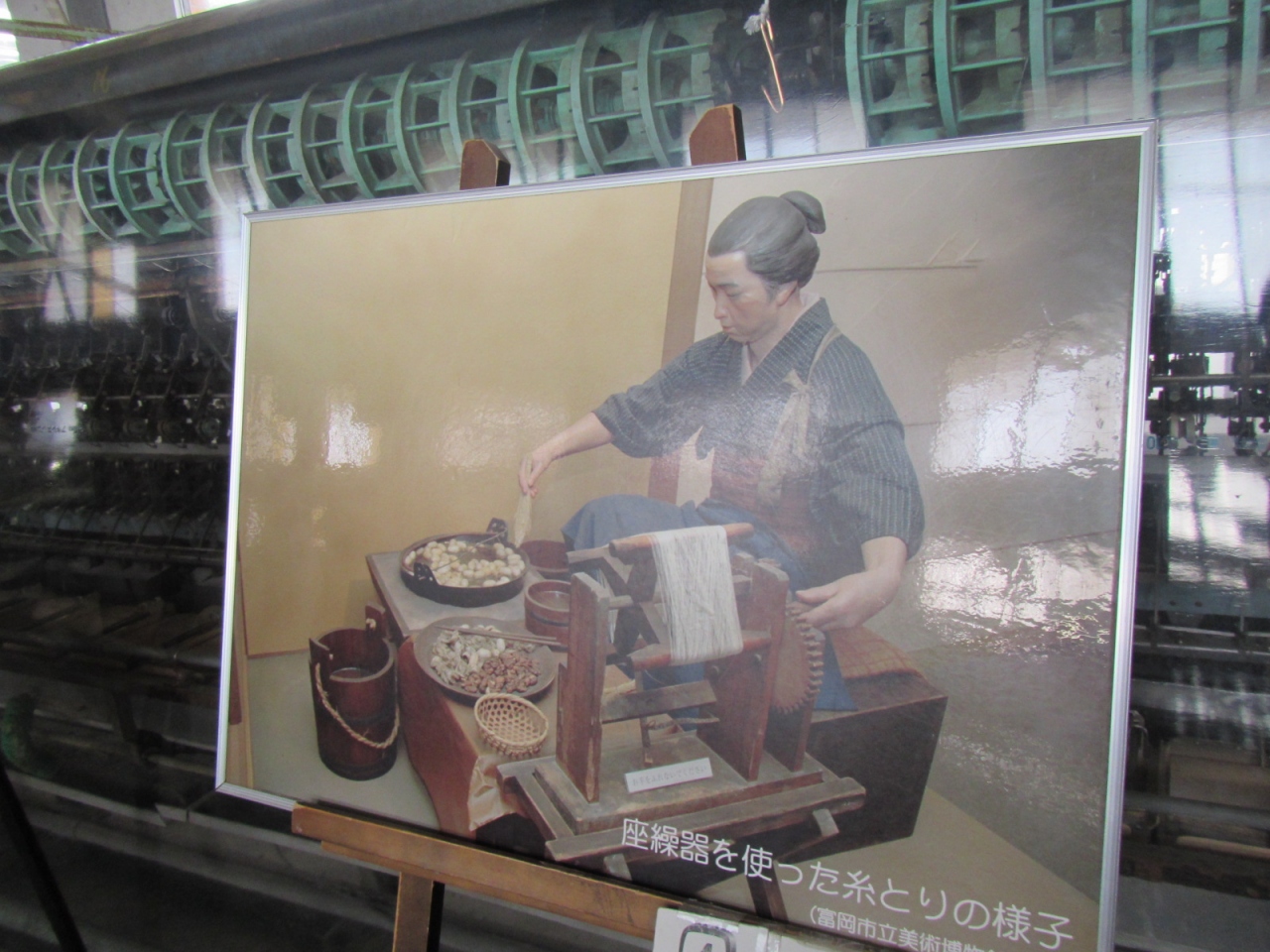 多くの繰糸機が並んで壮観なのですが、実はいずれも昭和40年台に導入された比較的新しい時代のもので、明治時代に行われていたものは絵で解説があるだけです。