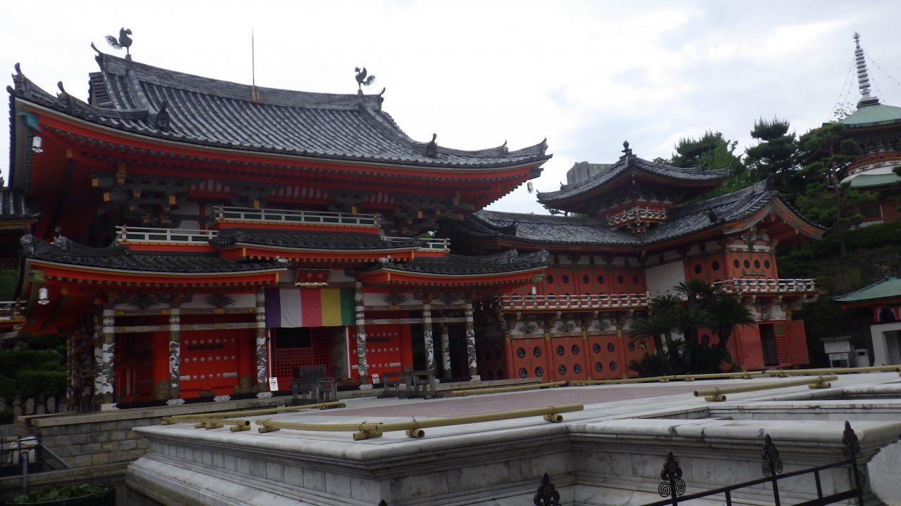 次に耕三寺に、ド派手な山門を入り五重塔、彫刻に覆われた日光陽明門に似た孝養門その奥に本殿、全て豪華煌びやかな建物です。本堂横から千仏洞に入ります、細長い洞窟に石仏が所狭きに鎮座、千体あるか分かりませんが・・・。洞窟を出ると大きな救世観音が目の前に現れます。案内板に従い少し歩いて大理石の大彫刻群の未来心の丘に行きます。入館料大人1400円でしたが見ごたえのある浄土真宗のお寺さんでした。瀬戸田港近くにある向上寺に国宝の三重塔があります。潮音山に朱塗りの室町時代に建てられた各層彫刻が施され建物です。