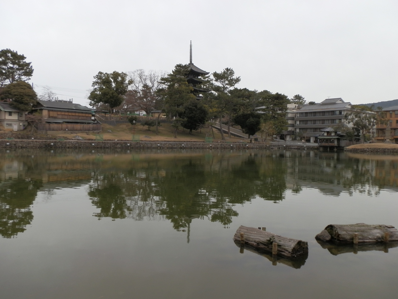 興福寺五重塔が水面に映える風景を撮りたく、撮影ポイントを探した。五重塔の上部だけが写るポイントが多い。五重塔の周囲には木々があり、五重塔の下部を遮る。また、五重塔の近くに近代的な建物があり、それを避けて撮るのも難しい。人工的な岸辺もあり、それを拾う場合もある。