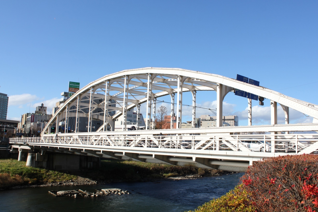 盛岡駅と盛岡市街を結び、北上川を渡る白いトラス橋で、昭和の雰囲気が残る頑丈な橋です。