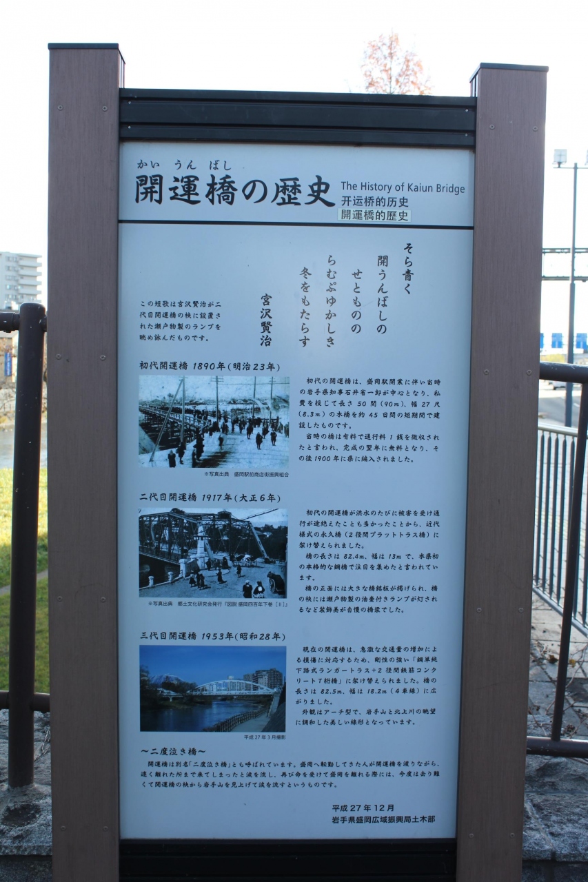 橋の袂にある案内板によると、初代の開運橋は1890年に当時の岩手県知事が中心となって私費で建設され、現在の開運橋は3代目で1953年に完成した4車線の立派な橋です。