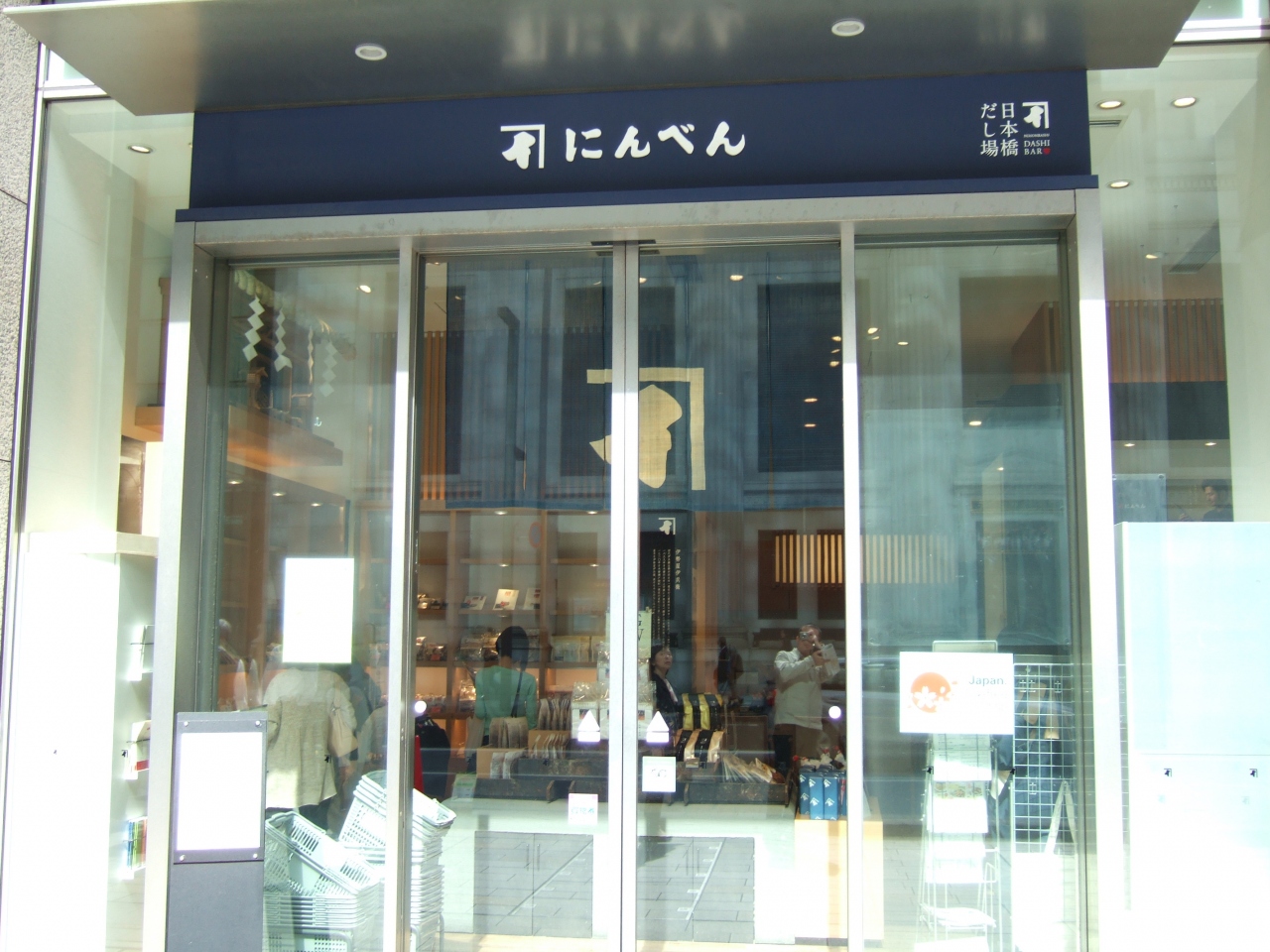 コレド室町の1階にある、にんべんの本店。お店の入り口にカウンターがあり、出汁を味わうことができますが、立ち食いのイートインスペースは狭く、小さな丸テーブルがいくつかあるだけで、いつも人でいっぱいです。