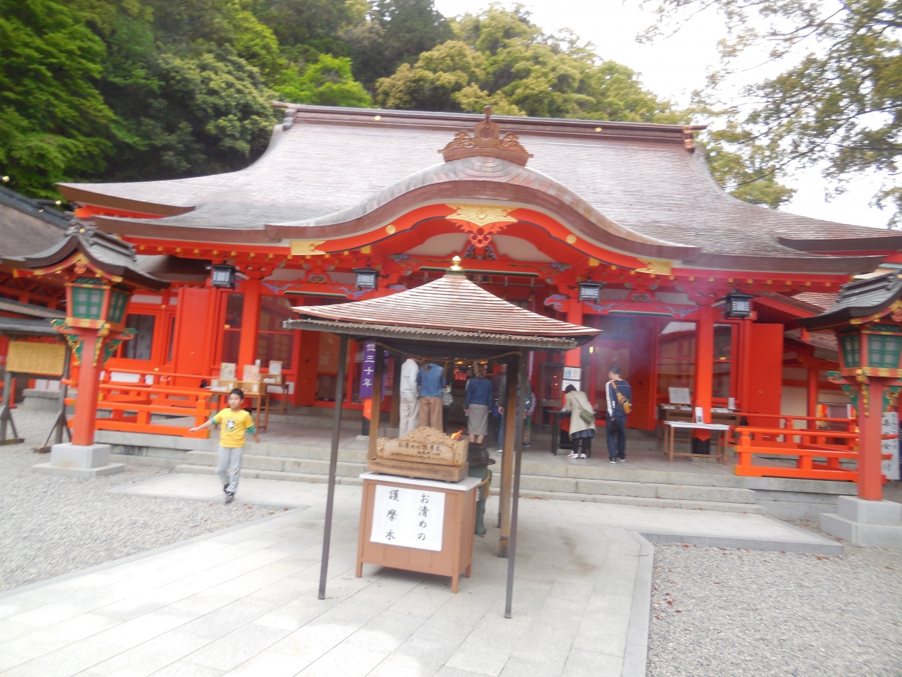 熊野本宮大社、熊野速玉大社、そしてここ熊野那智大社の3社で熊野三山と呼ばれています。熊野速玉大社はほぼ平地、熊野本宮大社は明治時代まで平地にありましたが洪水のために高台に移転、それに対してここは下から10~15分くらい登った山の中腹にあります。少し遠くに那智の滝が見え、隣の寺院の三重の塔と重なった風景が一見の価値があります。
