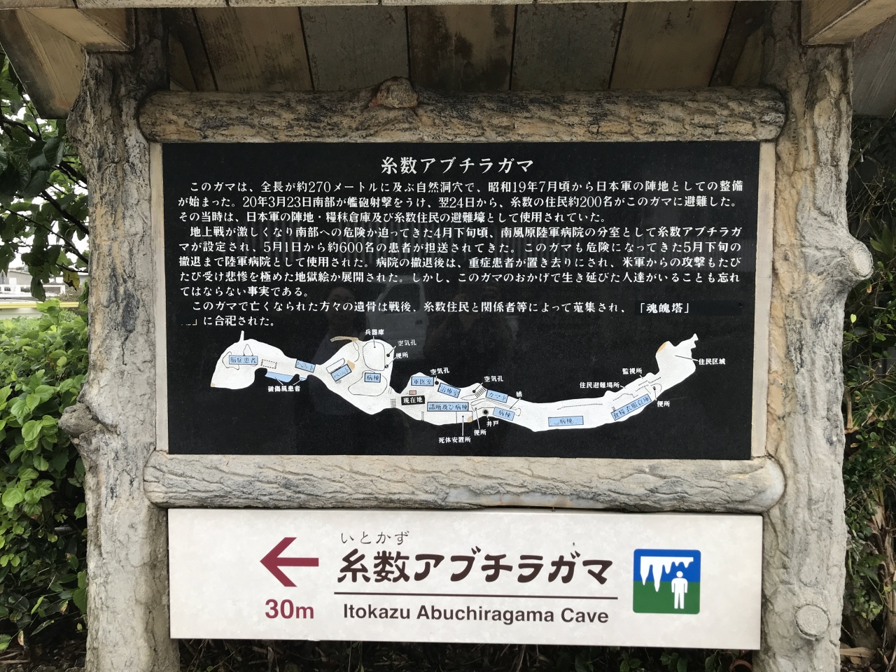 本来は自然の洞窟。300メートルほども続く長い洞窟です。しかし、太平洋戦争時には、避難場所や病院施設として、この洞窟が使われ、戦禍の悲惨なことがあった場所。見ていくと、言葉に表せない、感慨深いものを感じました。