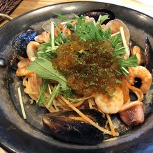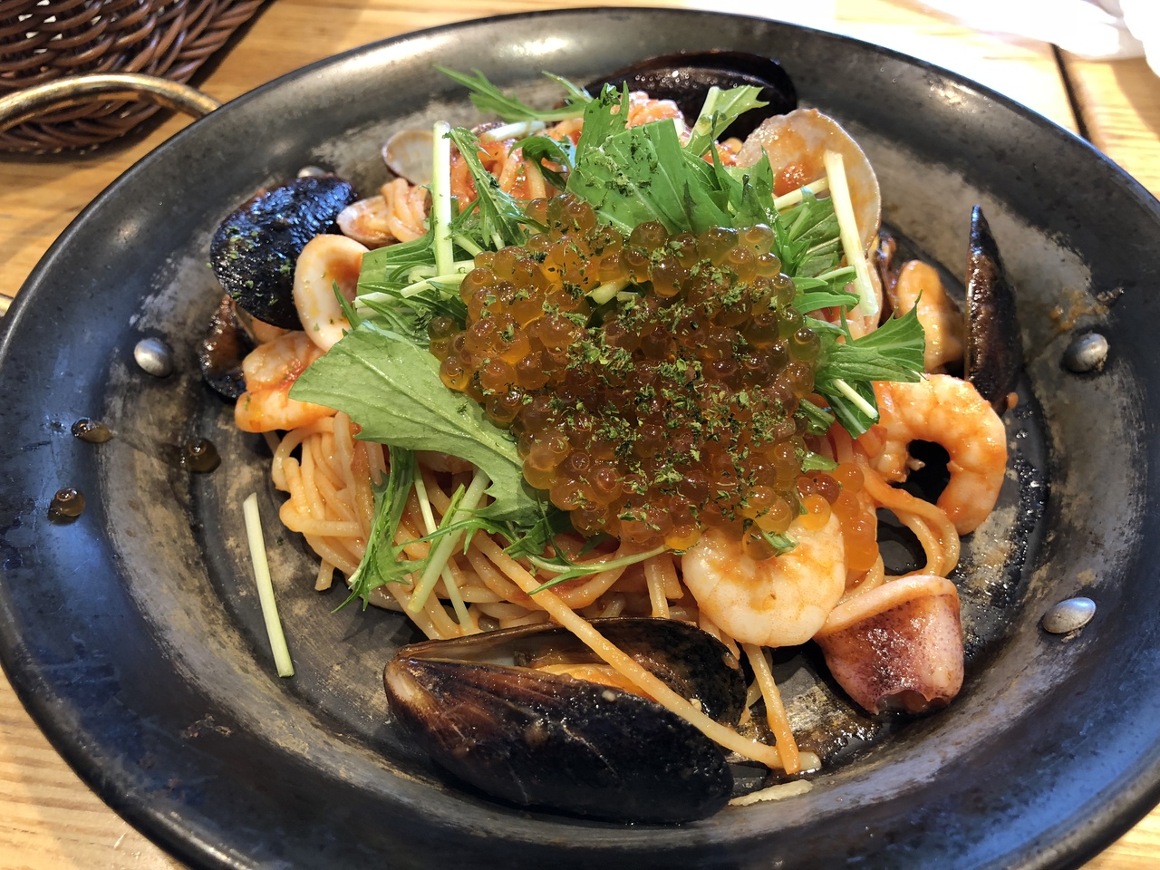 平日利用でランチ、それほど混んでもいませんでした。ペスカトーレにイクラがのってるパスタを食べました。どちら好物なのですが、食べた感想としてはトマトソースとイクラって正直合わないなと思いました。イクラはやはり和風系パスタでしょう。