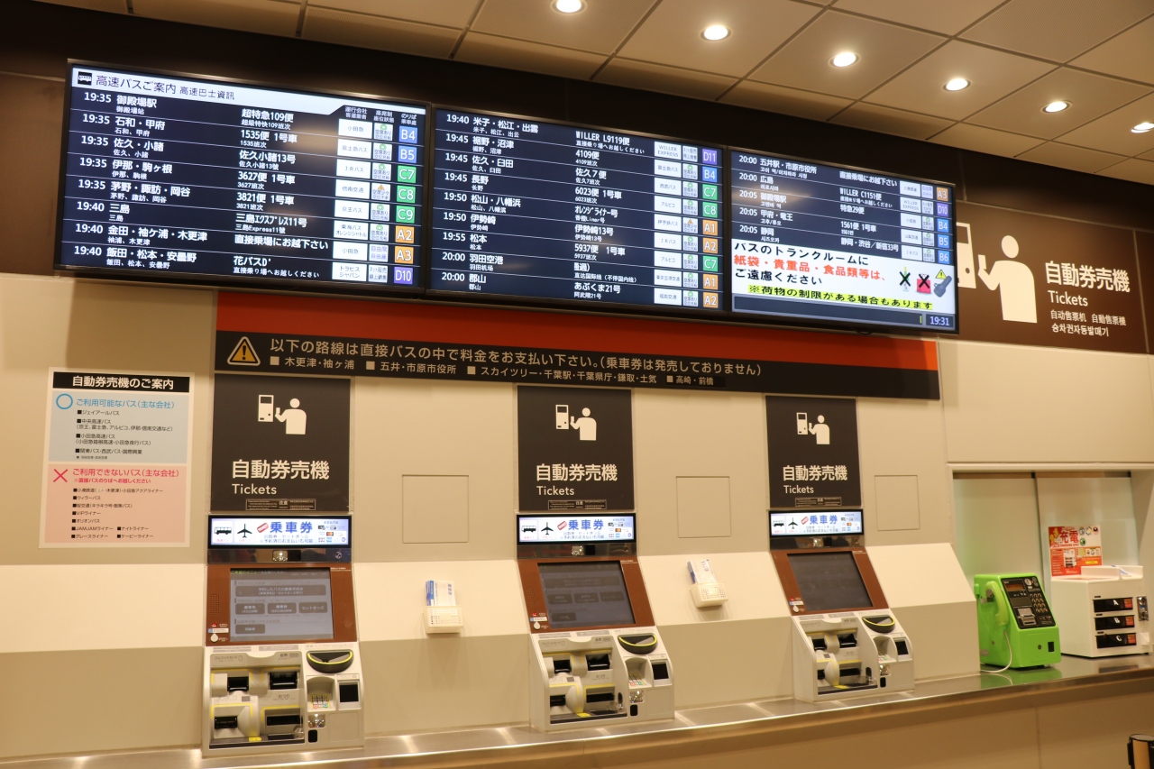 JRバスや小田急・京王など老舗バス会社からWILLER・JAMJAMなど新規参入事業者まで数多くのバス会社が乗り入れており、関東近郊だけではなく遠く博多まで結ぶバスもあります。東京空港交通や京王・小田急バスなどは券売機でバス乗車券を購入することができますが、オンライン限定販売のバス便も多いので注意が必要です。