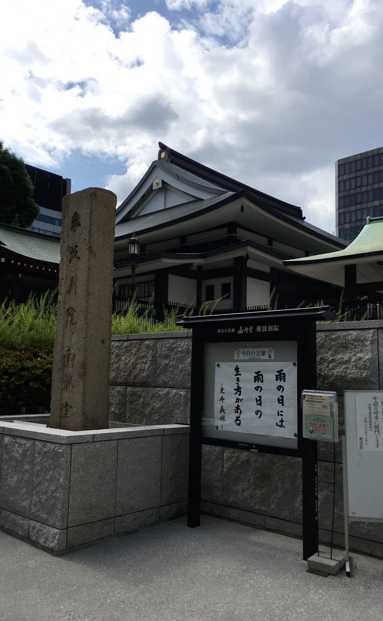 今は敷地にホテルを建てているので御堂筋からはあまり見えなくなりましたけど、いまでも立派なお寺さんです。脇から入るといつも筆をつかった文字で一言がかいてあっていかにもお寺さんな感じ。拝観もできますが、前述の通り半分以上の面積が工事中なのであまり風情はありません。