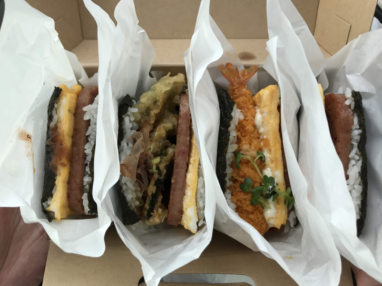 大人気の「ポークたまごおにぎり」のお店。時間帯によっては、けっこうな行列ができていることがあります。この日は、行列がなかったので、サクッと買うことができました。基本のポークたまごおにぎりに、トッピングでいろいろな具材を挟むことができ、新しい味を発見できました。