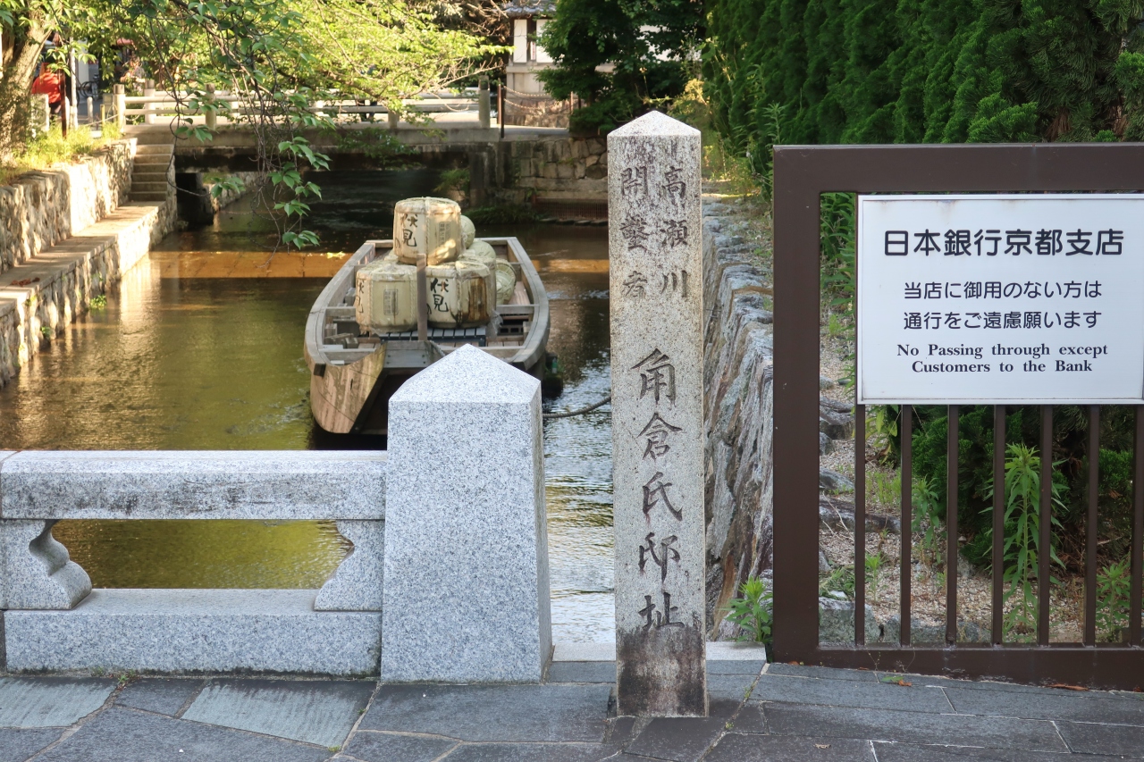 石碑をそのまま読めば高瀬川を開削した角倉氏が江戸時代に邸宅を構えていた所だ。が、深読みすれば高瀬川の歴史を物語る石碑だといえる。高瀬川を開削した豪商の角倉了以は高瀬川の最上流にあたるこの場所に邸宅を構え、以降、幕末まで角倉家が高瀬川を運航する舟から運航料を取って高瀬川の管理運営をしていた。規制を緩和して民間に思い切って委ね、経済発展を享受してきた歴史が垣間見える。