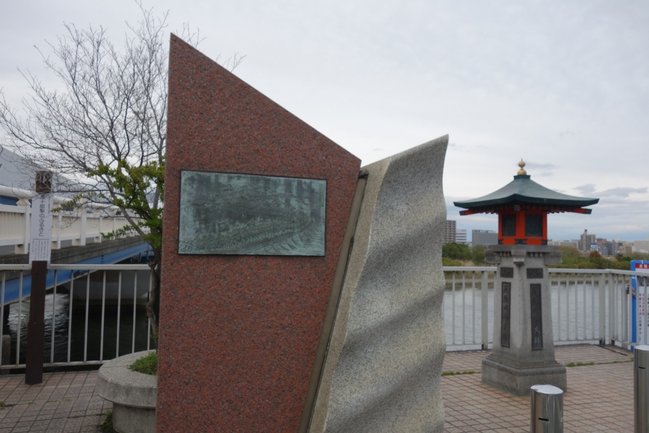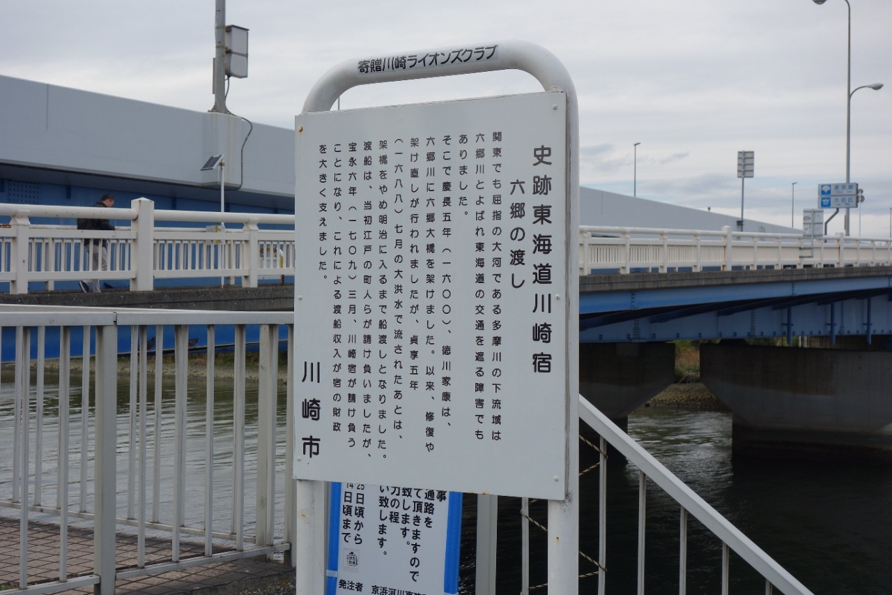 旧東海道の宿場町としても重要な川崎宿が有ったこの辺りはかつて橋が架かっていましたが、それが流されてからは舟渡しが川を渡る交通手段となっていました。その六号の渡し跡が多摩川のほとりに有りました。碑と解説板が有りました。