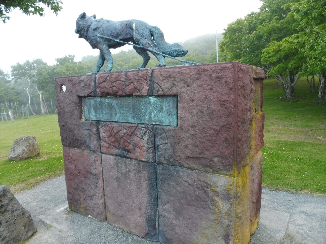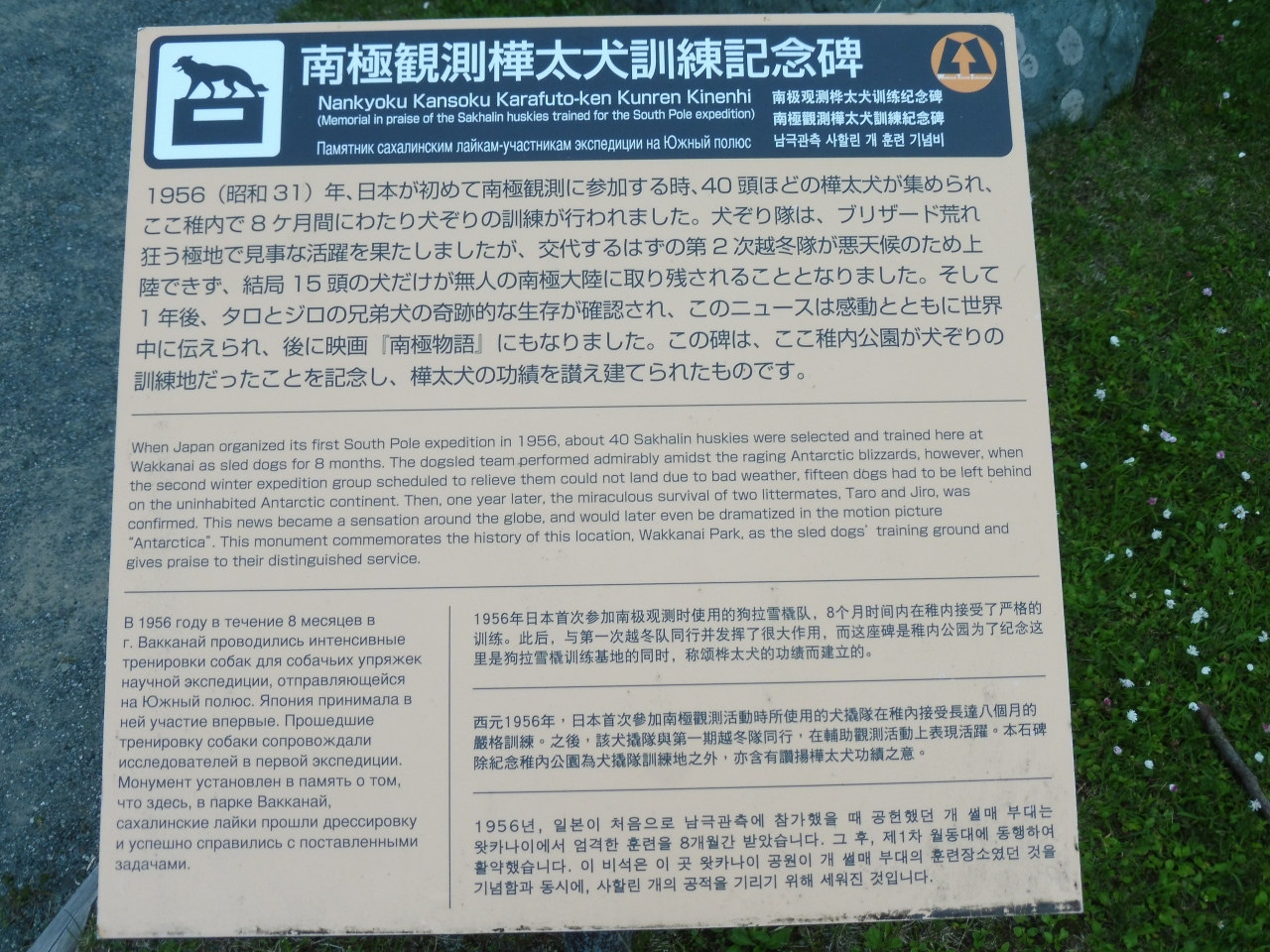 稚内公園の一角遊歩道の少し奥に有る大きな記念碑です。これは実話を基にした映画「南極物語」の南極観測隊が南極に連れて行った犬たちの記念碑&供養塔です。タロとジロが有名ですね。
