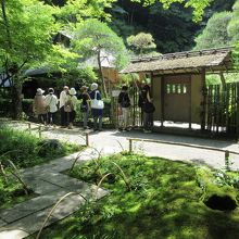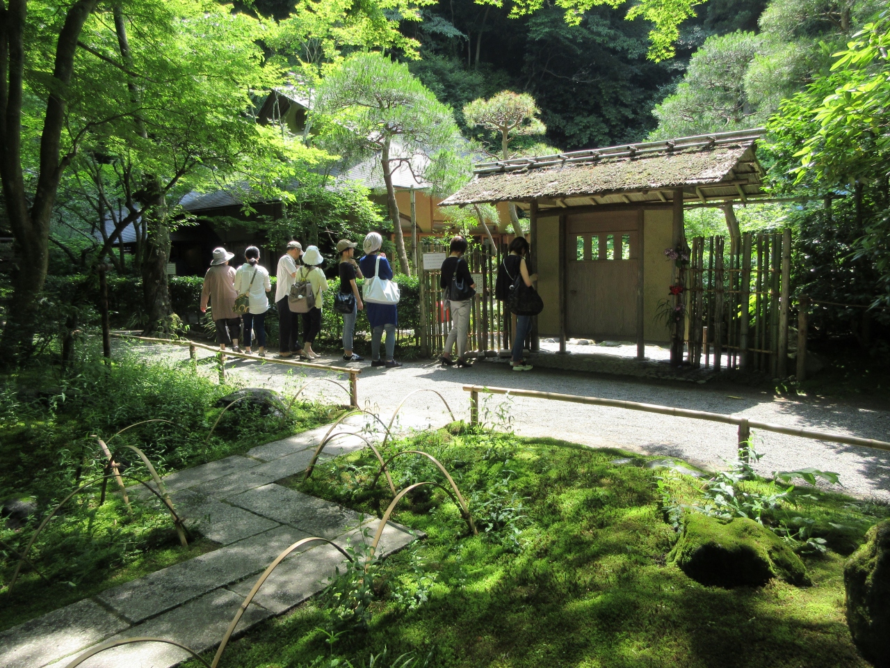 北鎌倉駅から500mの明月院の拝観口を入った左奥にある茶室です。訪れた時月笑軒の入り口前に8名並んで9時半営業開始を待っていました。コーヒーなどのドリンク類や和菓子と抹茶のセットなどがあります。テラス席は木陰にありここで休んでいると寺院の境内であることを忘れてしまいました。アジサイや花菖蒲の観賞でにぎやかな場所と離れているので静かでした。