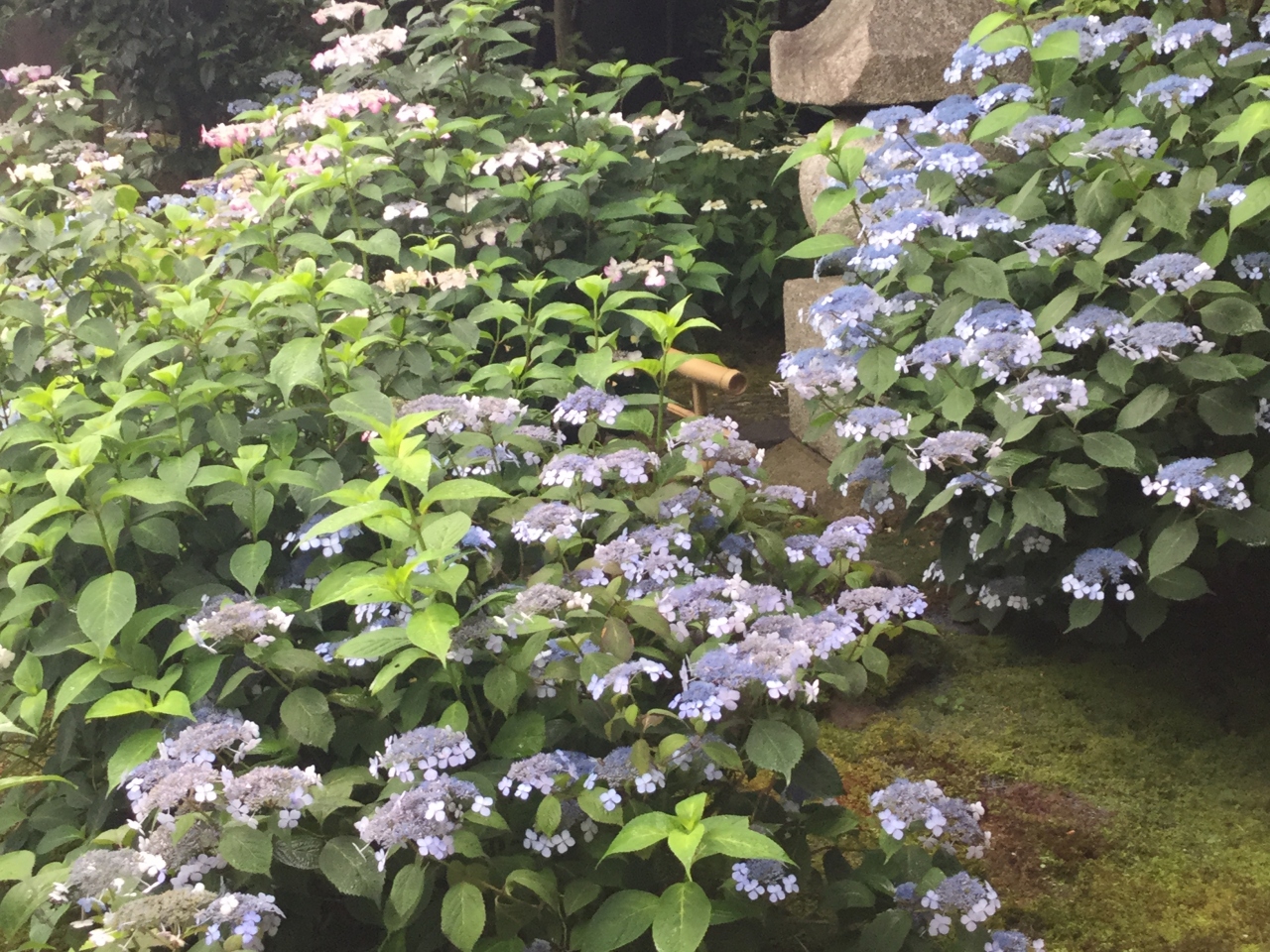 京都の祇園の南にある建仁寺の中に有る霊源院で甘露庭を見る事が出来ました。建仁寺の門を入ってから少し歩き、霊源院が見えて門をくぐって、受け付けをして上がります。そして紫陽花と似てる甘茶の花、その中でシーボルトが日本の紫陽花と紹介したと言われている、幻の紫陽花のシチダンカも見る事が出来ました。甘茶の花の青い世界の中で、シチダンカはひっそりと可憐に咲いて心に沁みわたる初夏の光景でした。縁側で甘露庭を座って眺め、風鈴の音がして心に涼風がふくように涼やかになれました 。