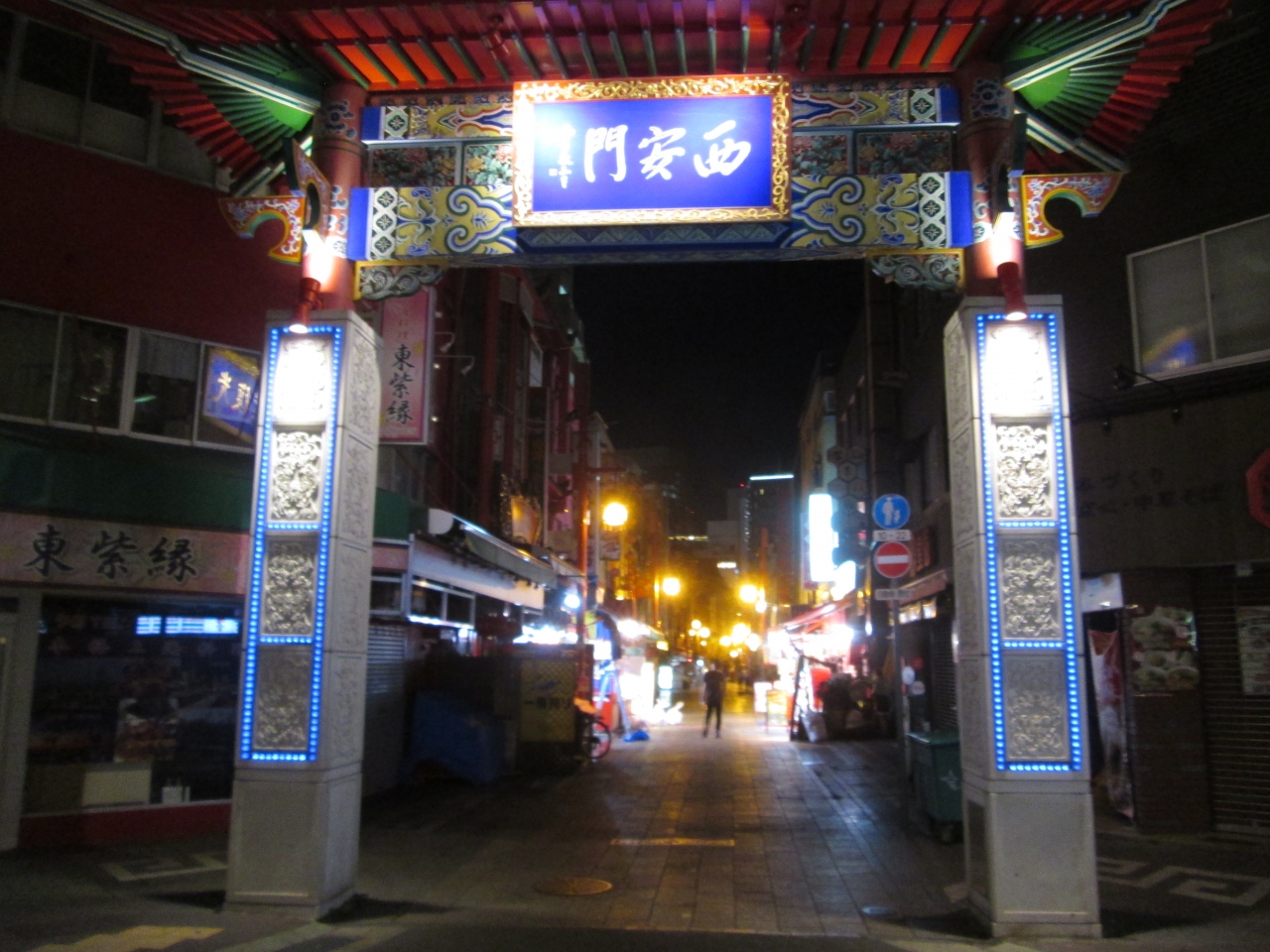 夜の南京町 西安門に訪問しました。中華街全体が震災の影響を受けたのか比較的新しくなった印象を受けました。阪神元町駅のすぐそばで、駅前の北側の元町一番街と長安(東)、西安(西)、海榮(南)の三門で仕切られた比較的狭い一画でした。夜の門は青のシンボルカラーにライトアップされていました。