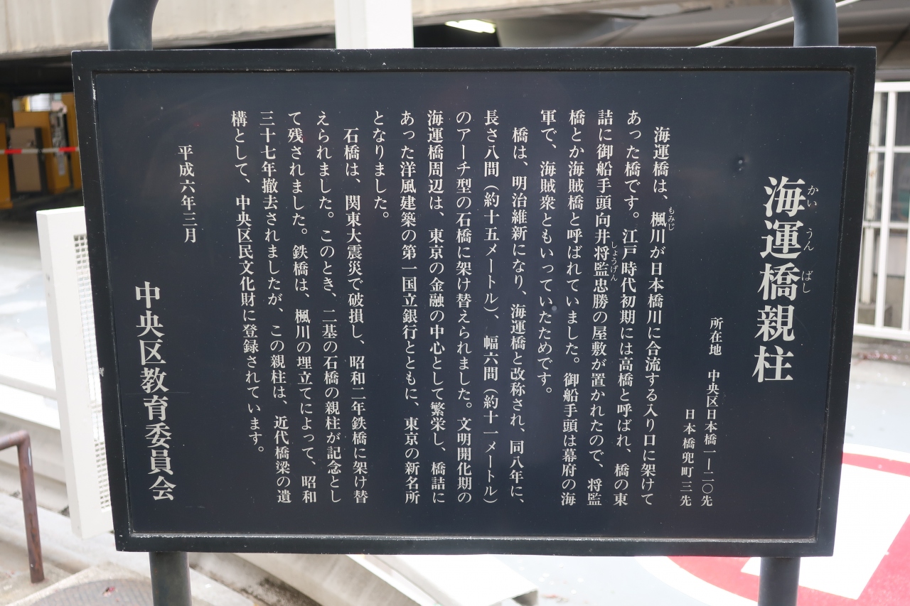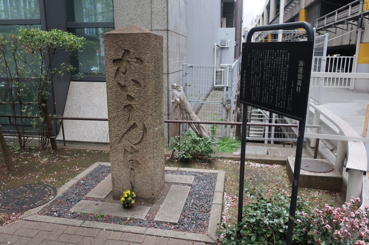 兜町 藍沢証券本社の首都高速側にある小さな公園の中に海運橋親柱が置かれています。現在首都高速環状線がある場所は楓川が埋め立てられた場所で、この楓川に明治8年に架けられた橋が海運橋。楓川の埋め立て時に撤去された海運橋の記念に残された親柱がこれです。