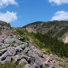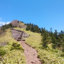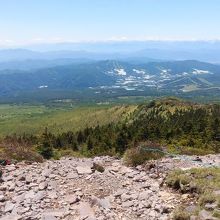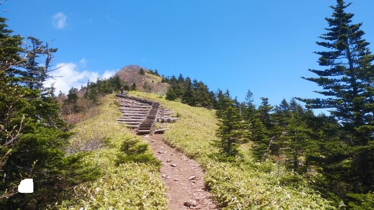 菅平牧場より根子岳を経て登頂。根子岳からいったん下ったあと樹林帯の急登がけっこうきつかった。肩ほどの高さまでササが生い茂っている区間もあった。急登を克服すれば菅平牧場からの合流点に至り、そこから山頂まではもう少し。