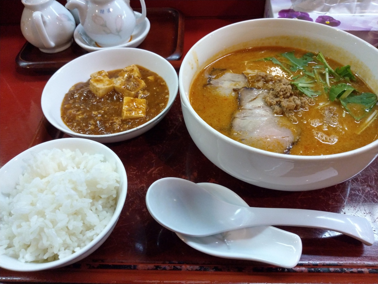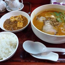 狸小路にあった担々麺専門店です。14時ごろでしたのでお客さんは私だけでした。注文したのはランチセット。担々麺にマーボー豆腐とご飯がセットになってます。担々麺はしっかりと辛くて、山椒がピリッときいていておいしかったです。