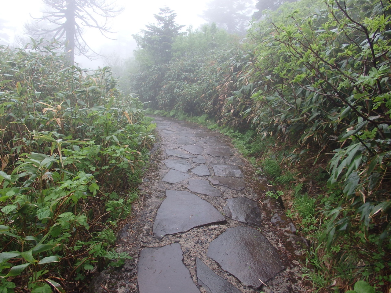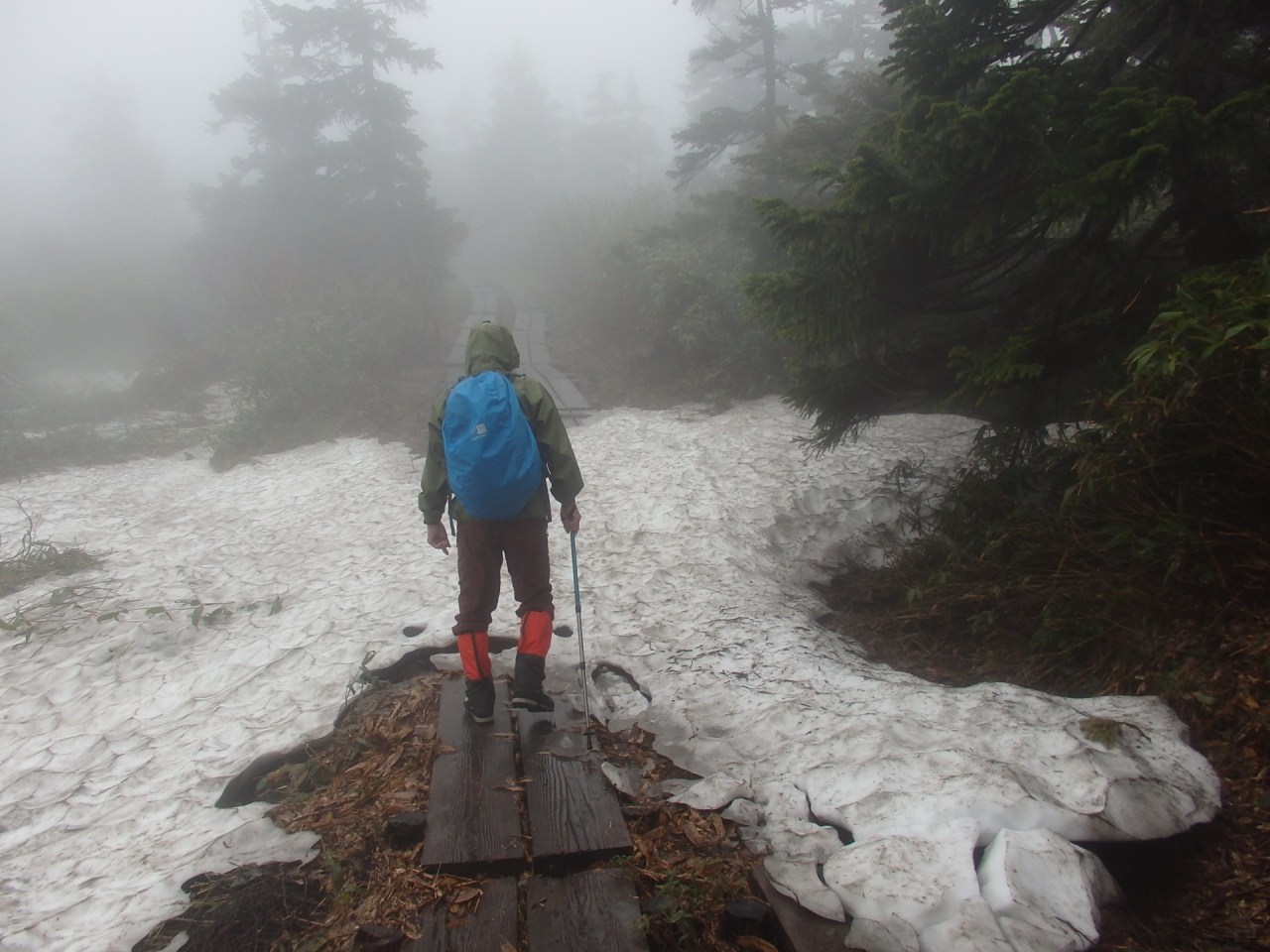 盛岡駅の天気は薄曇り、八幡平頂上バス停では一転して濃霧と霧雨です。バス停右手の石段を下り、トンネルを潜り抜け、見えない鏡沼、めがね沼を通過し、緩やかな登りを経て36分八幡平山頂(1613M)に到着。展望台が建っているが濃霧で回りが見えない。八幡沼北の湿原を歩き、黒谷地湿原まで歩く予定であったが、生憎の天気のため、源太分れで右に行き周遊して八幡平頂上バス停に戻る。本日のコース、標高差50M以下、濃霧と霧雨のため目的地まで行かなかったため、歩行時間も1時間50分、ドラゴンアイや展望台からの針葉樹林帯も見られず、眺望が全くない無い軽ハイキングでした