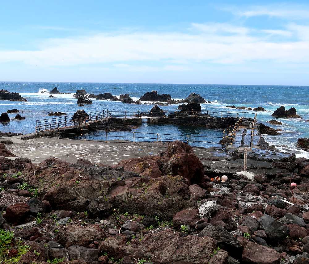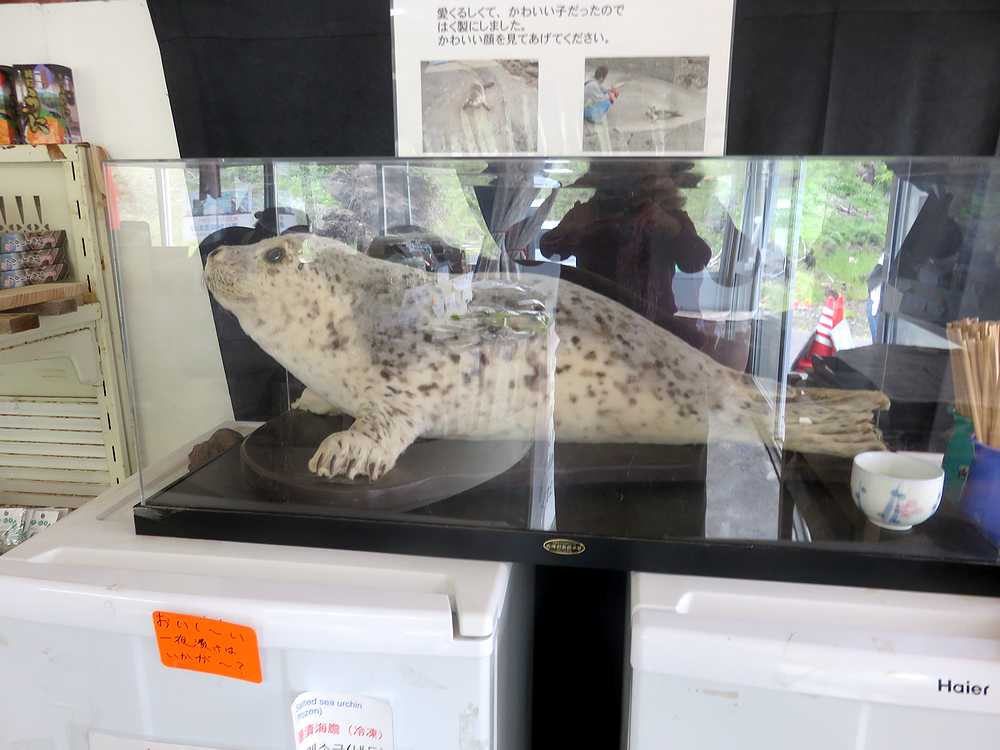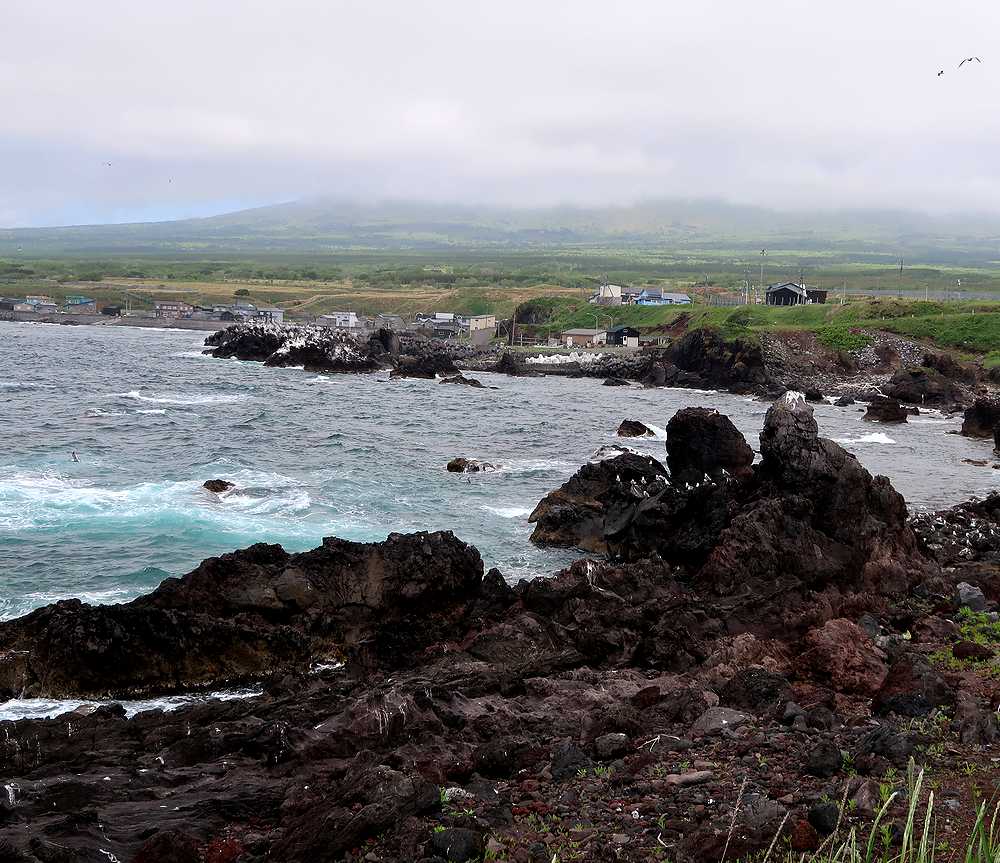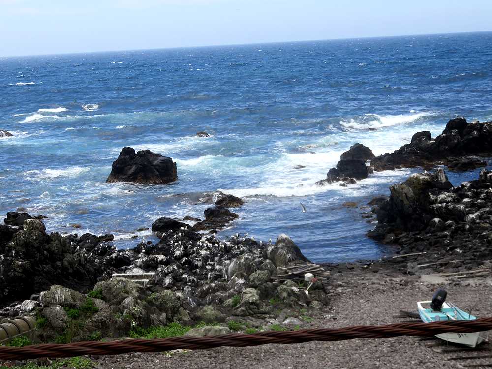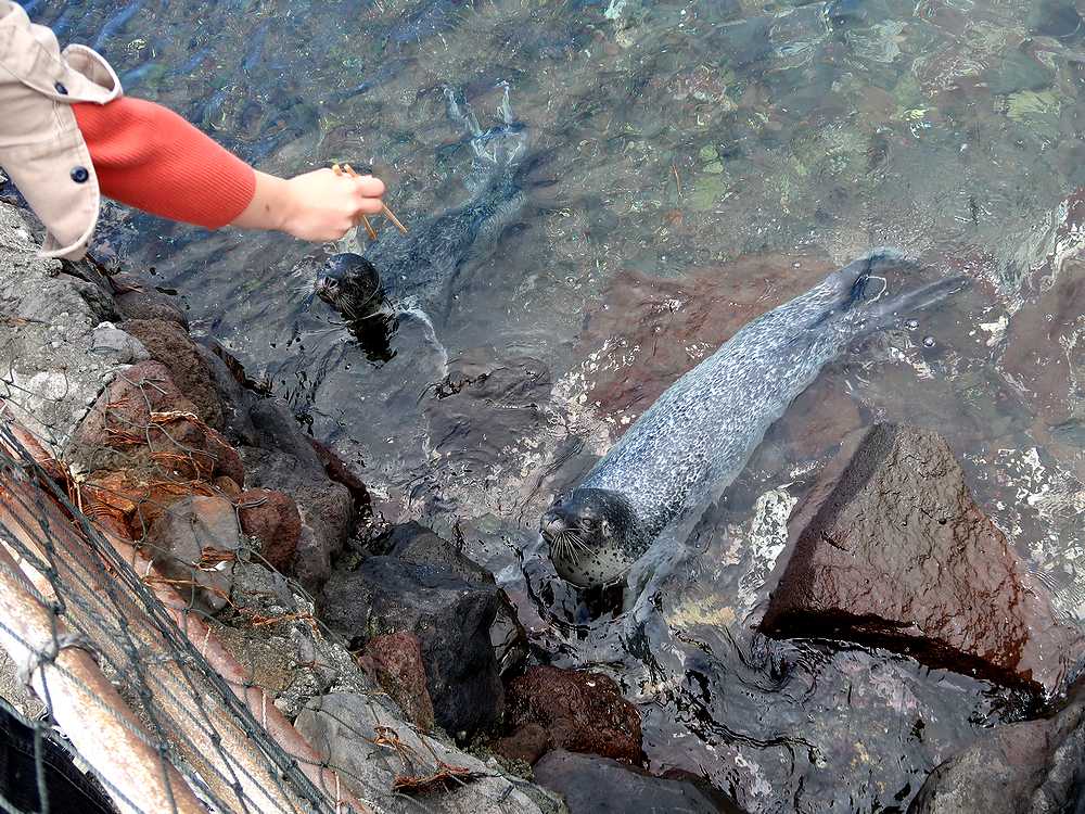 公園は島の南側の溶岩が流れ出てできた黒っぽい奇岩が連なる海岸にあり、火山島独特の景観が見られます。その中の岩場に生け簀のようなかこいの中に2頭のゴマフアザラシが飼われていました。入り口にある海産物の土産物店で、1椀100円の餌を買いもとめ、生け簀に近づき、箸の先に魚の切り身をはさんで、見せると、すぐに泳ぎ寄ってきました。金網からアザラシまでは距離があり、口の中に直接入れてあげることはできず、生け簀の縁の石の上に落ちた餌を食べさせてあげるのに苦労しました。大勢の観光客が押し寄せた時は餌のやりすぎにならないのでしょうか? お椀を返す時、そのまま帰るのは悪い気がして、ついお土産と買いすぎてしまいました。商売上手だなと思いました。