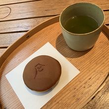 新緑のまぶしいお庭が良い雰囲気を醸し出しています。それを眺めながら、どら焼きと煎茶のセットを頂きました。煎茶は、おかわり可です。