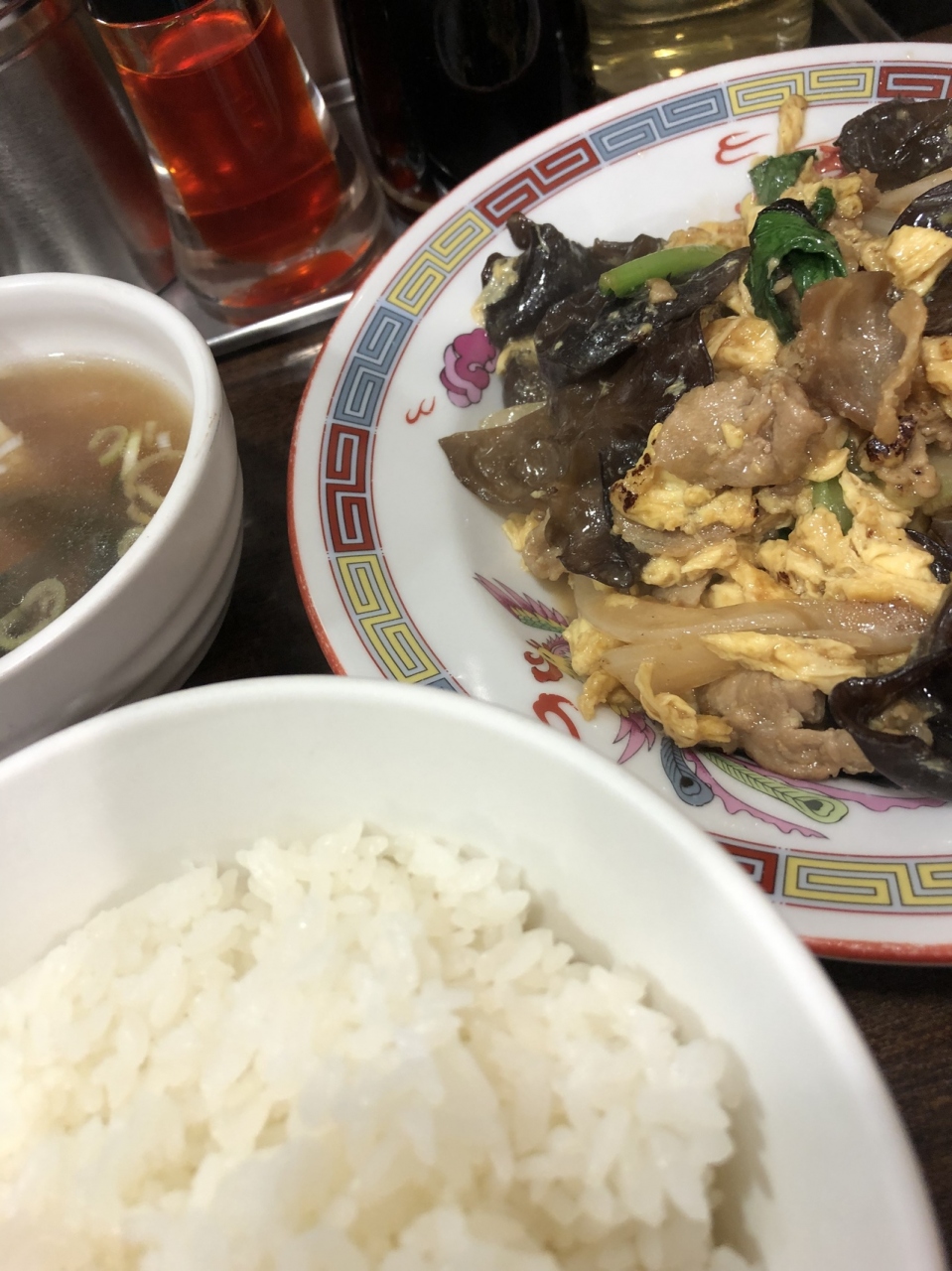 サンマーメンを食べたかったけど「きくらげと豚肉の玉子炒め」に惹かれて、コレの定食にした