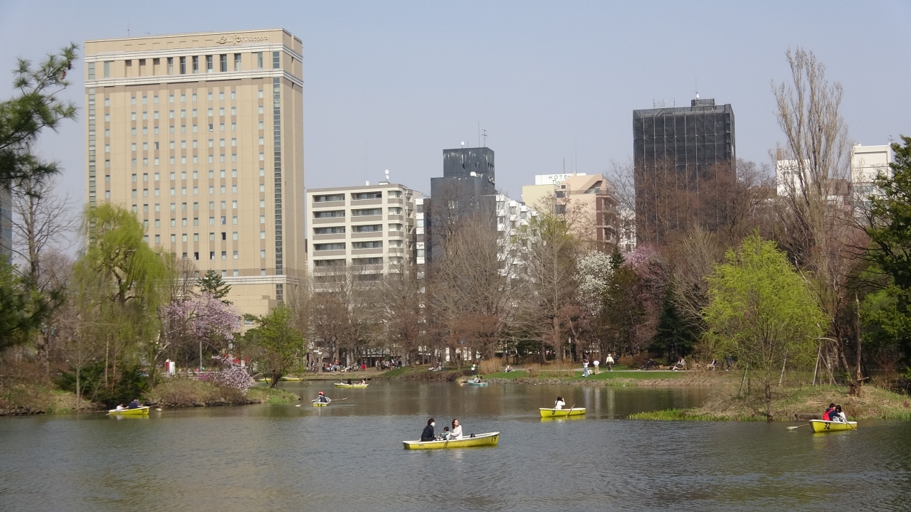 ちょっと公園で休もうと思って中島公園へ。大通公園もいいけれど、こっちの公園は遥かにほぼ静寂です。さすがの北海道も4月下旬になると桜が咲き誇り、ボートも営業してます。桜の並木の下を散歩したり、その木の下でピクニックや日向ぼっこ、カップルでデート、ペットと一緒に散歩をするなどが主な過ごし方になります。