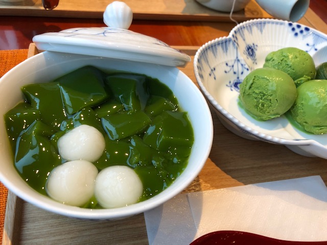 今まで何度か通りがかって、いつも行列ができていましたが、土曜日の朝11時ごろに行ったら、並ばずにさっと入れました。席に着くと、最初に煎茶のセット(急須とお湯のポットを湯のみ)が出てきて、お茶の説明をしてくれます。このこだわりのお茶が実に美味。チャージがつくのかと思いましたが、サービスでした。