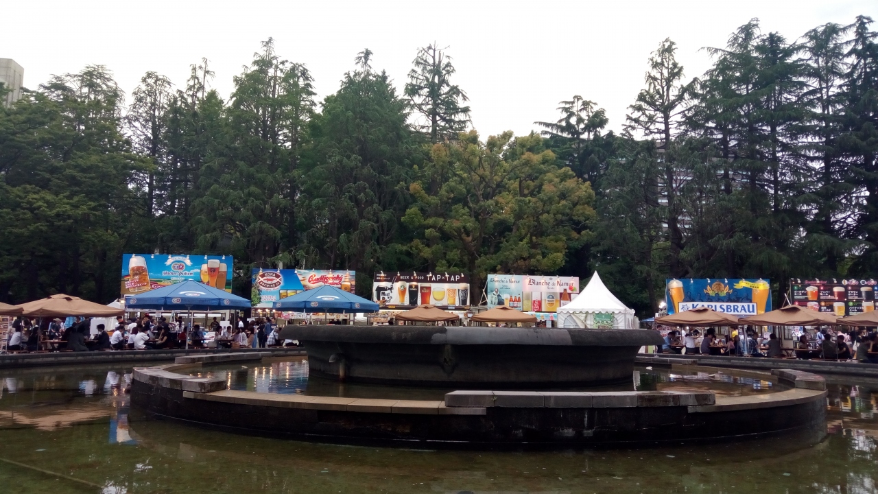 今回は「ヒビヤガーデン」に行きました。噴水広場を会場にしてビールと食べ物を売る露店が10数軒立ち並び、自由席のテーブルに持ち寄って飲食します。