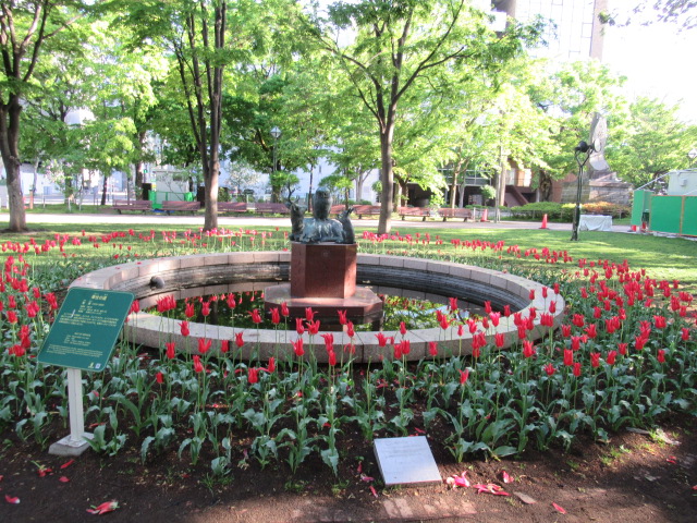 札幌中心部に位置する大通公園は、西1丁目にあるテレビ塔から西13丁目の札幌市資料館まで東西に続く札幌を代表する公園になっています。西6丁目付近には元武蔵野美術大学教授の彫刻家の峯 孝氏によるもので、池の中央に「奉仕の道」の像があって周囲が花壇になっていて四季折々の花が植えられています。台座は硬く耐久性に優れている赤い花崗岩、その上にシカやフクロウ、ウサギさんなどの動物たちが楽しい会話でもしているような様子なのでしょうか。お花に囲まれた動物たちが何とも可愛らしいですよ。全ての作品が異なる表情を見せているのが素敵です。