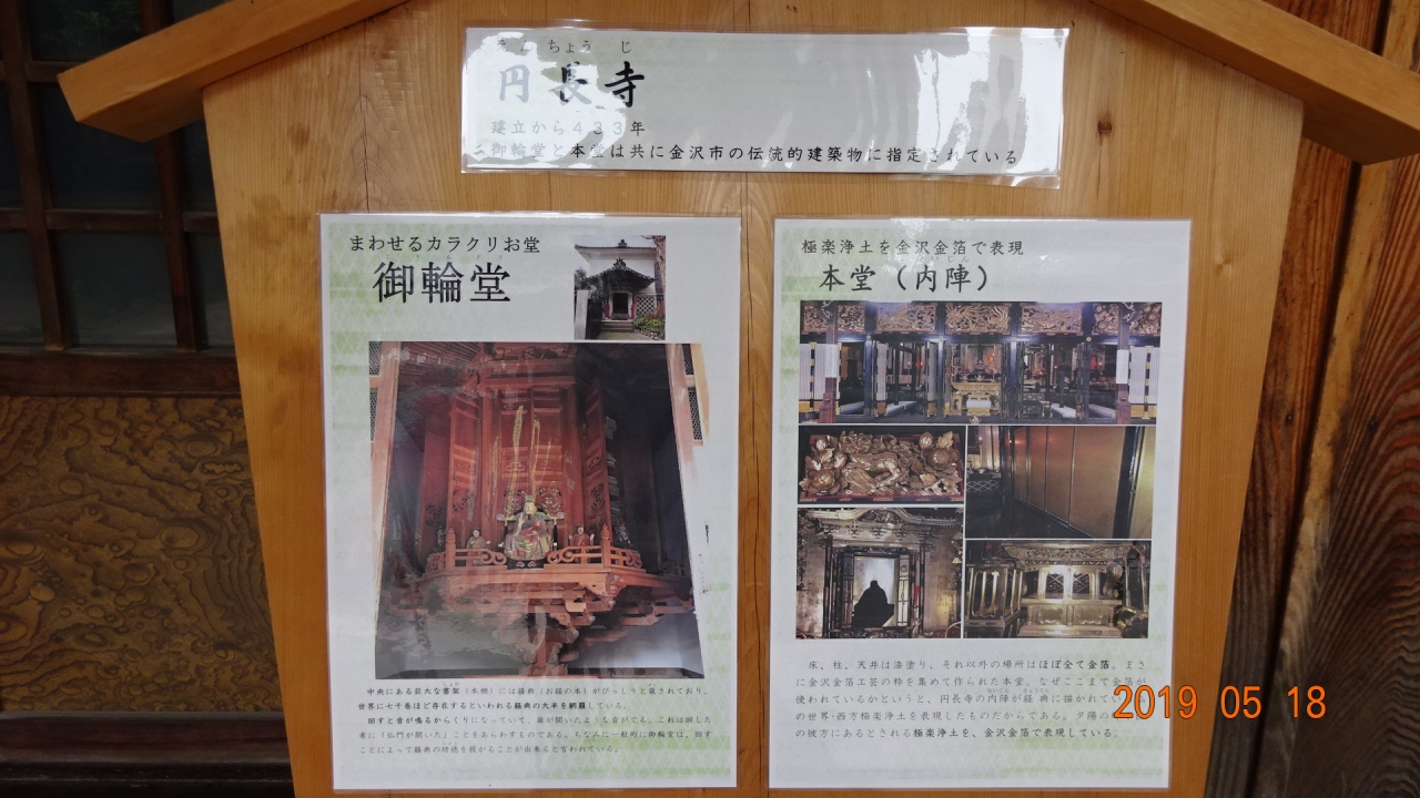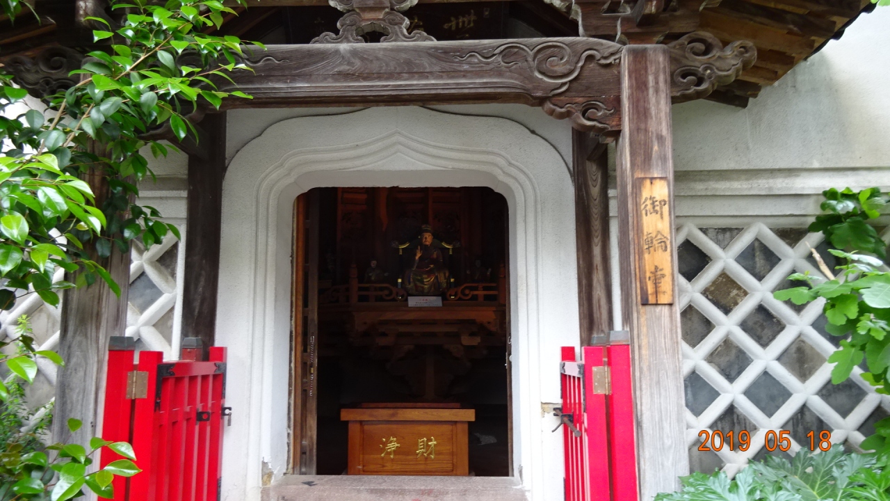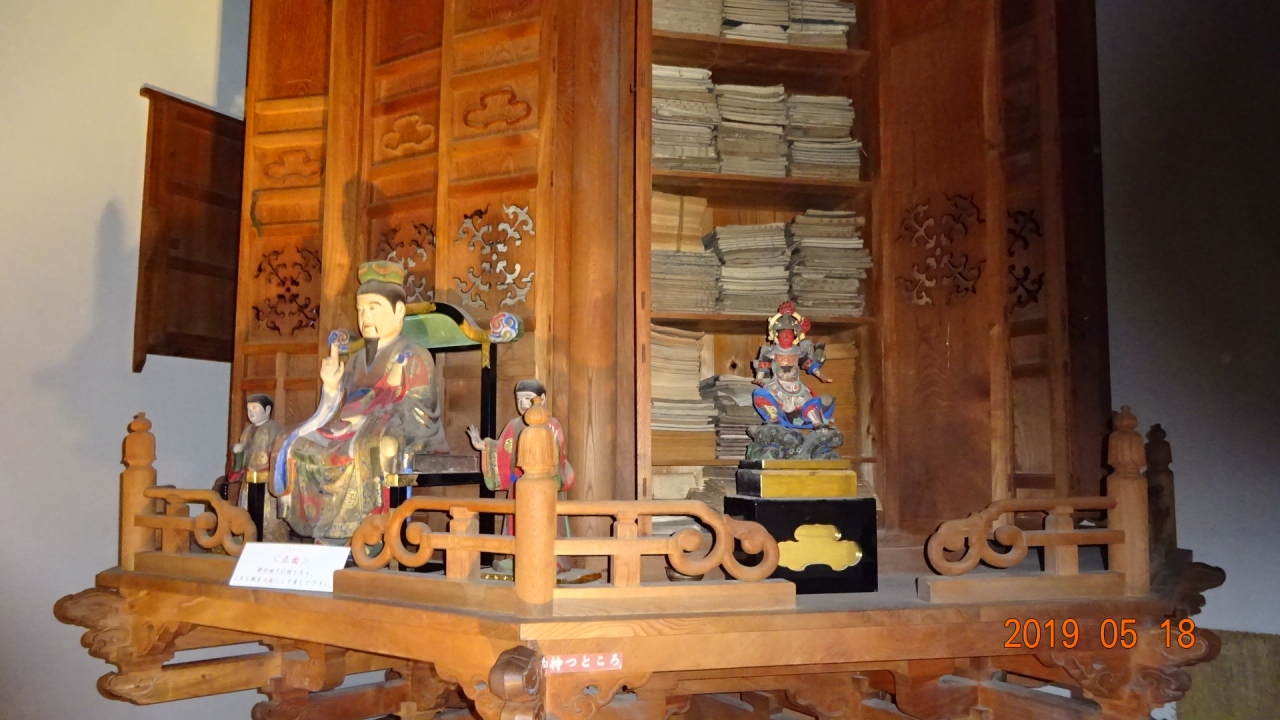 私がこのお寺に行きたかったのは、正面のカワイイ社殿ではなく、門をくぐってすぐ左にある六角造りの一切経蔵の御輪堂の中にある「書架」を廻すためです。円長時では「まわせるカラクリお堂」と説明しています。沢山の経典が入った蔵を廻すことができます。この音は書架を廻した者に「仏門が開いた」ことを表すのだそうです。廻すと音が鳴るからくりになっているとの説明ですが、きしむ音のようにしか聞こえませんでした。この音が「開いた」音なんでしょうか?