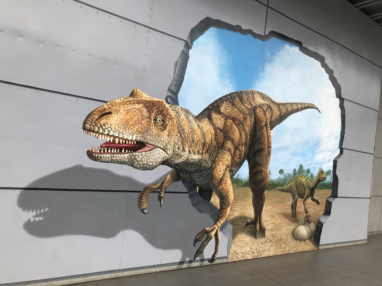 さらに駅に近づくと、壁にだまし絵が描かれていて恐竜が出てくる!という趣向。