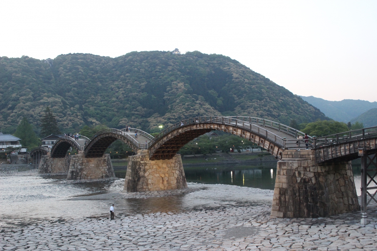 昼間と違った雰囲気の夕方の錦帯橋、ライトアップもよかったです。