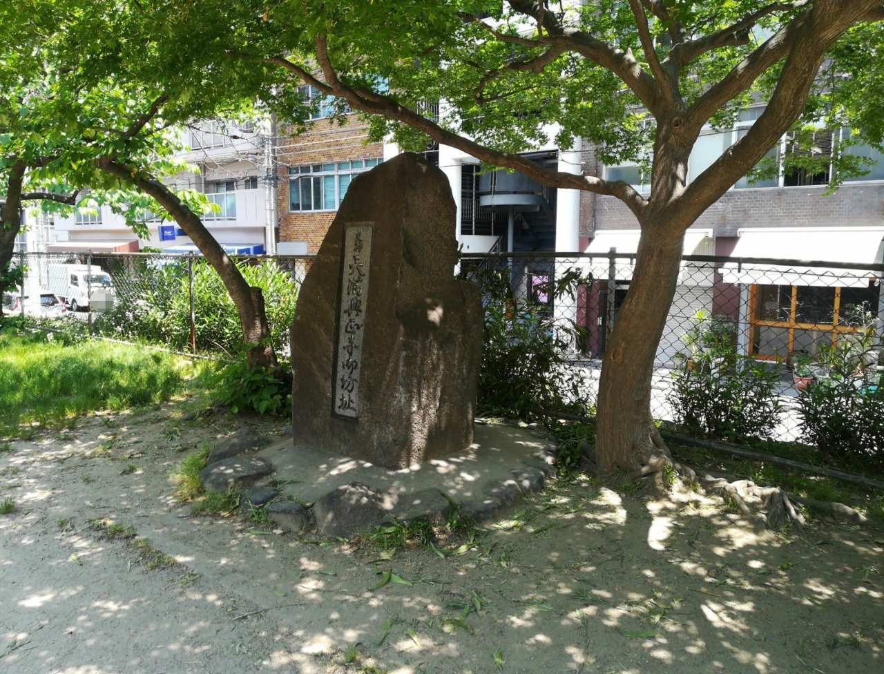 江戸時代からここには天満興正寺があったそうですが、実は明治時代に今の関西大学の前進である関西法律学校の校舎が、この寺内にあったそうです。戦災のためか現在は石碑しかなくて、まわりは滝川公園という広い公園になっています。