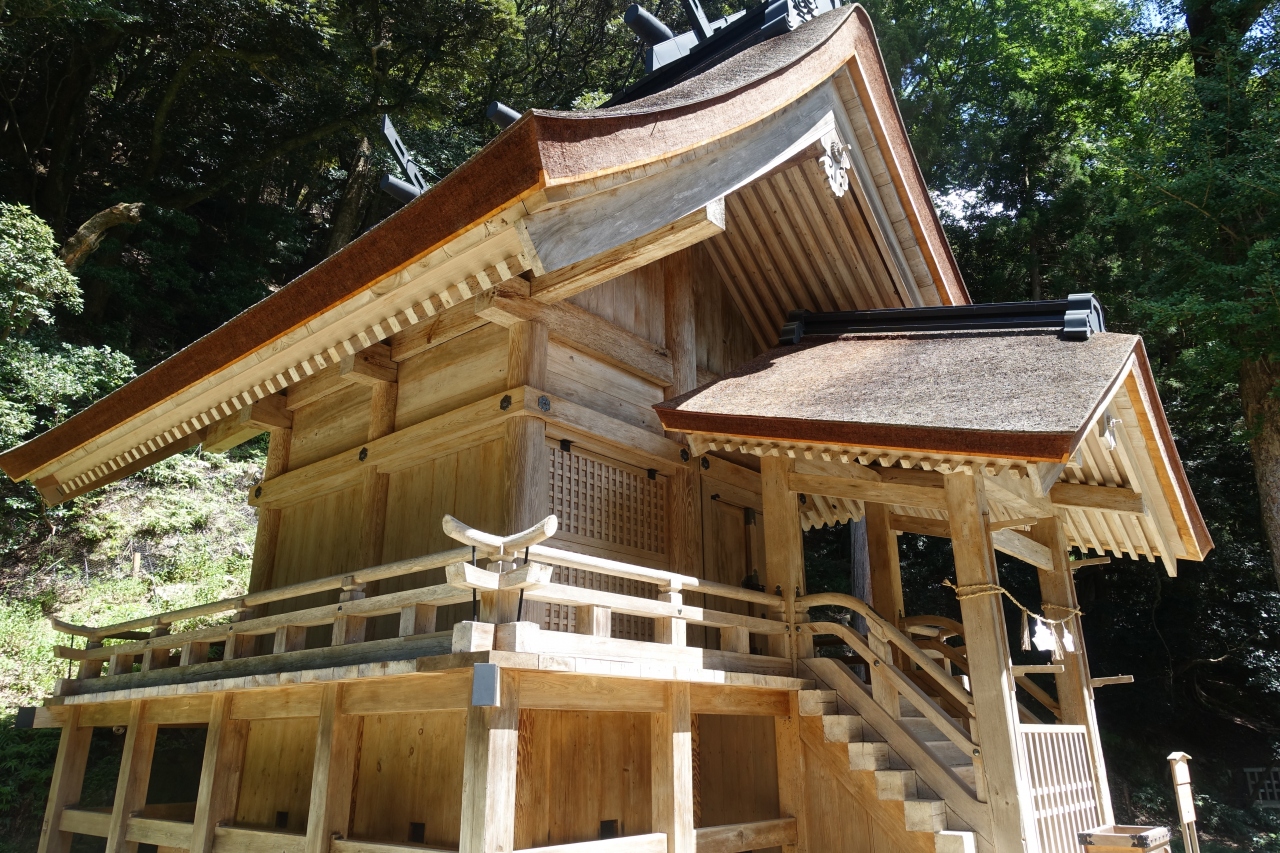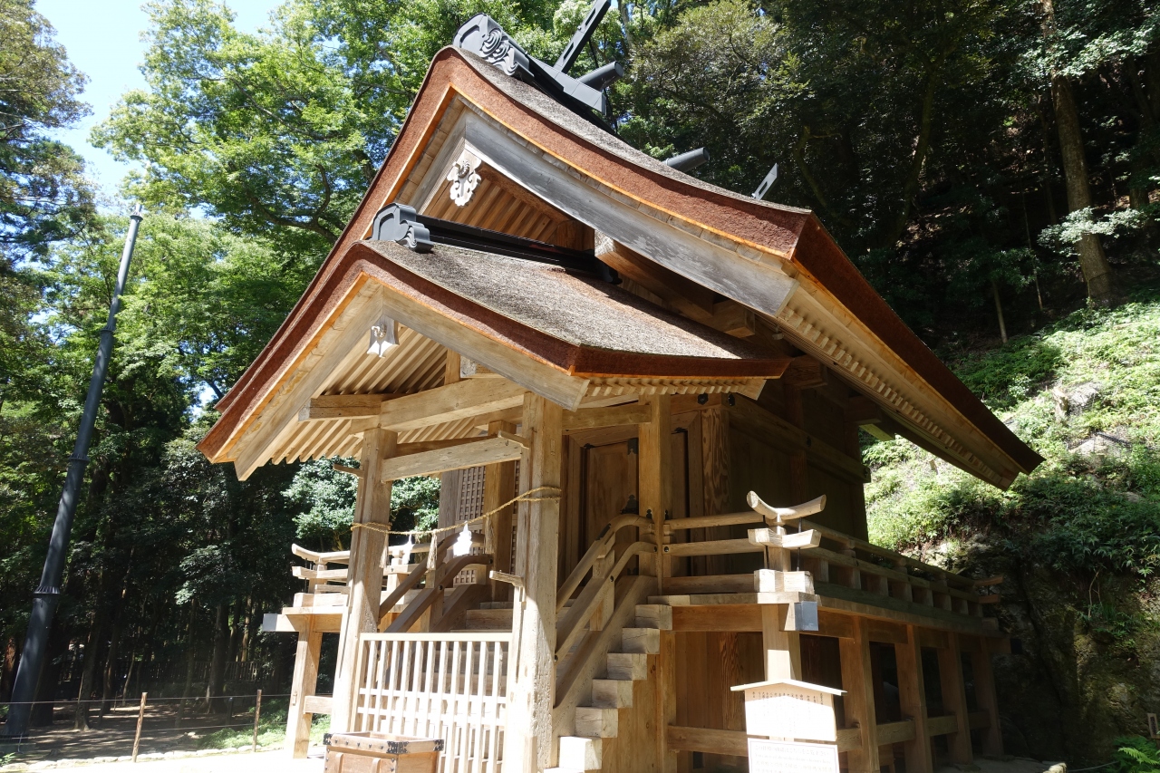 出雲大社境内にある素戔嗚尊(すさのおのみこと)を祀る神社です。出雲大社の本殿がある区域は塀で囲まれて中に入ることはできませんが、塀の外周をぐるっと回ることができます。素鵞社はこの外周部分の一番奥、本殿の真後ろにあり、一段高い石垣上に建てられていることからも特別なお社であることが分かりました。