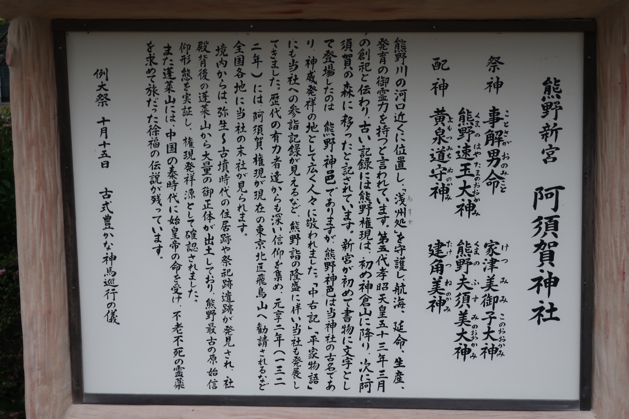 熊野川の河口南岸にある蓬莱山の麓に鎮座する熊野きっての古社が阿須賀神社です。現在の社殿は戦災で焼失したものを再建したもので、新しいですが、創建は何と紀元前423年と言われています。日本書紀に記される熊野神邑とされる場所でいわば熊野発祥の地と言われています。これほど、古社ですから行かない訳にはいきません。しかし、行ってみると、これほどの古社にも関わらず、訪れる人は殆どおらず、寂しい感が漂ってます。