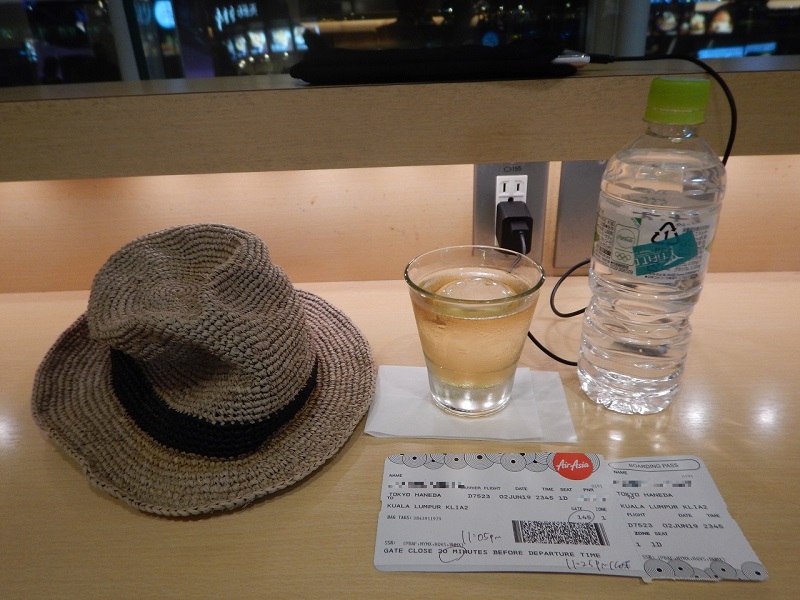 羽田空港から海外に向けて深夜に出発する際、時間調整と寝酒で利用しています。ビールやワイン、ウイスキーなどが提供されています。私のお気に入りは、竹鶴のロック(ダブル)です。おつまみはナッツなどを買うことができますが、コンビニなどでチーズ等を前もって買っておくといいかもしれません。近くのカウンターには充電コーナーがありますが、利用者が多いので席が空いていないこともあります。冷水とお湯は近くに無料のサーバーがあります。
