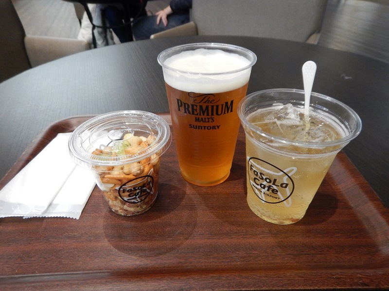 成田空港から海外に向けて出発する際、時間調整で利用しています。アルコールとソフトドリンク、軽食が提供されています。アルコールは、ビールやウイスキー、バーボンなどがありました。私のお気に入りは、ジンビーム(ダブル)のソーダです。おつまみはナッツなどを買うことができますが、コンビニでチーズなどを前もって買っておくといいかもしれません。
