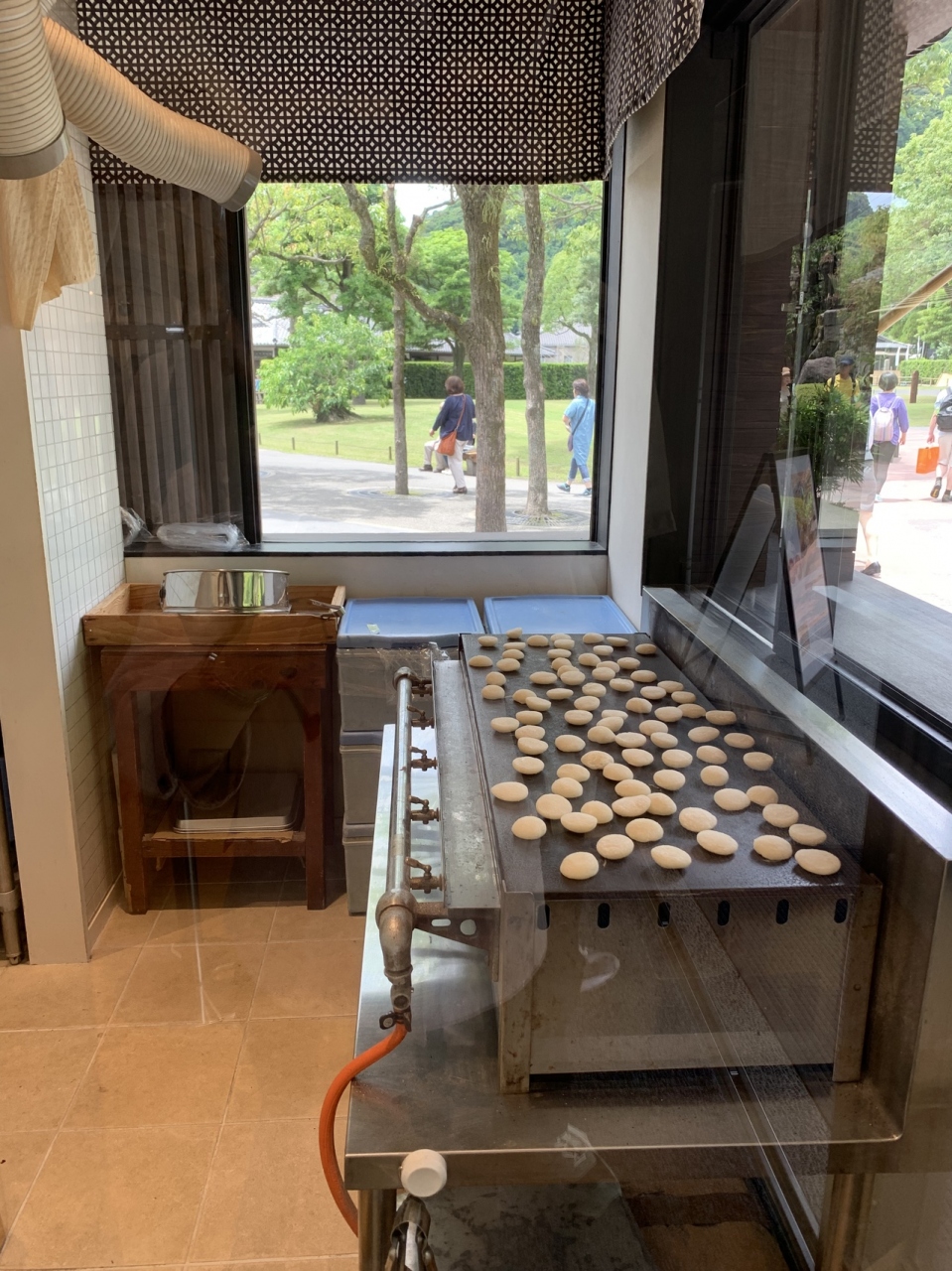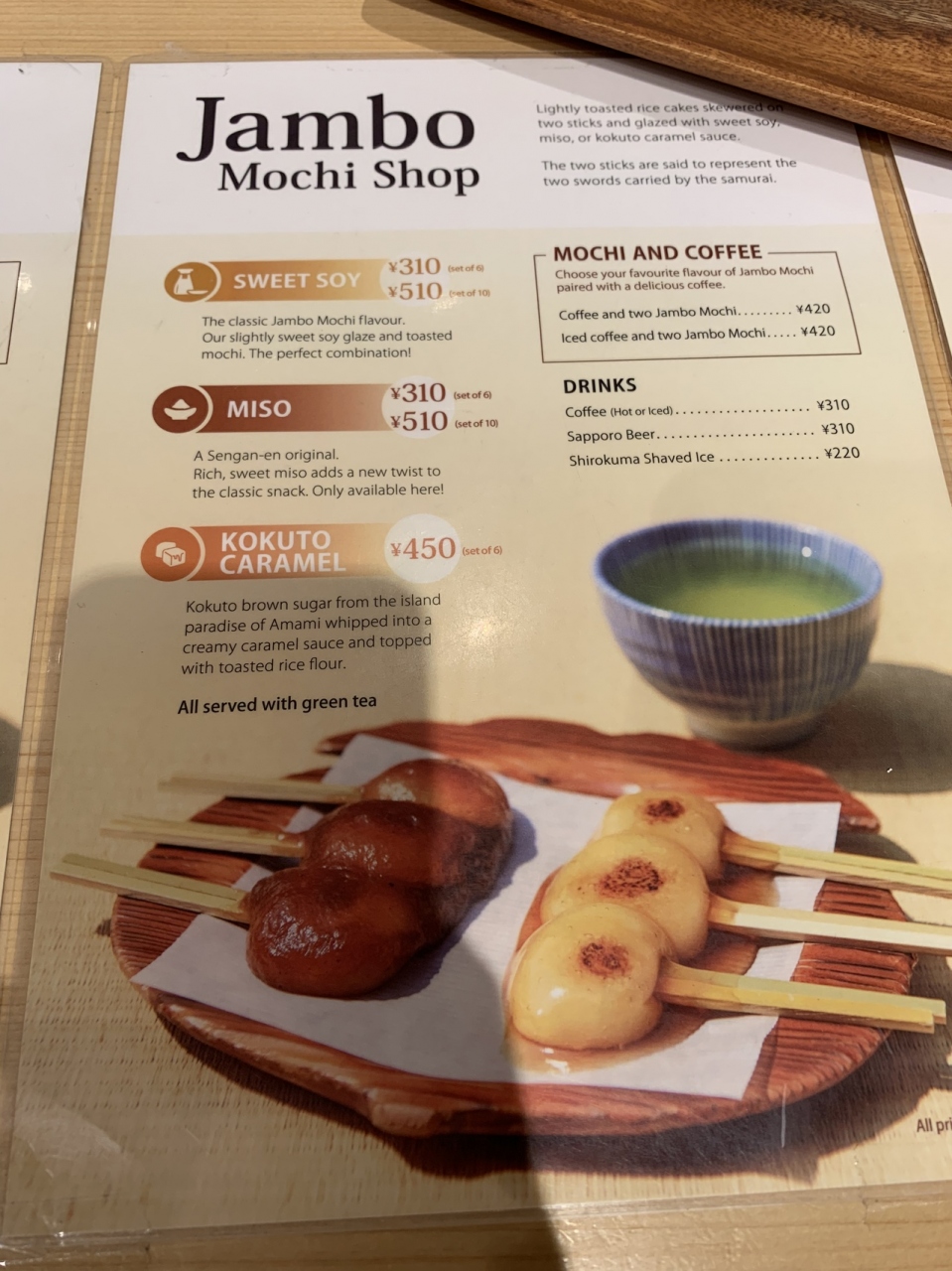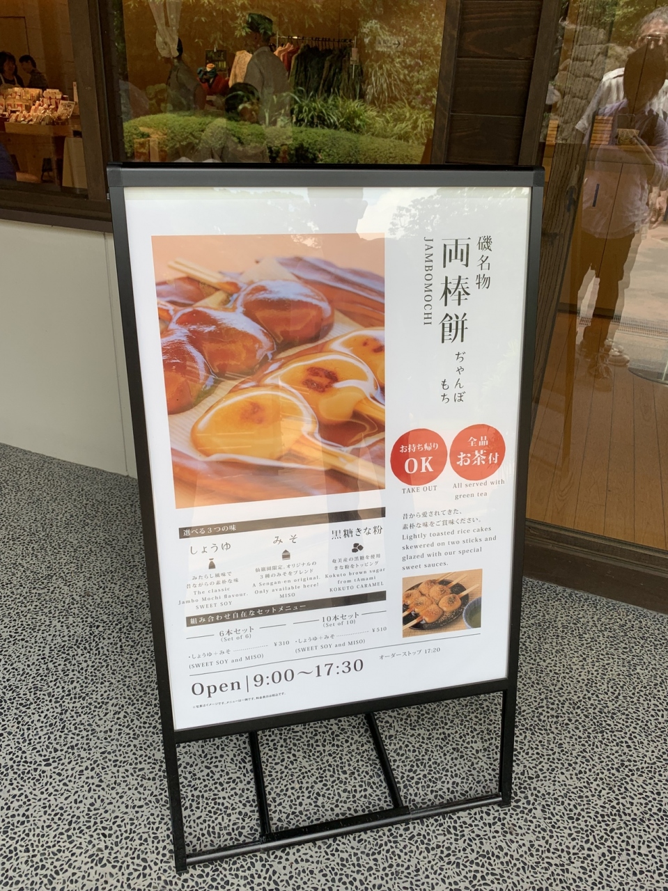 仙巌園といえば両棒餅(ぢゃんぼもち)。こちらのお店は醤油(みたらし)と味噌の各3本の計6本で310円です。お茶も人数分いただけます。仙巌園の入場券を購入時にJAF会員証を提示するとこちらの両棒餅(醤油と味噌各1本)の引換券をもらえました。結構ボリュームがありました。