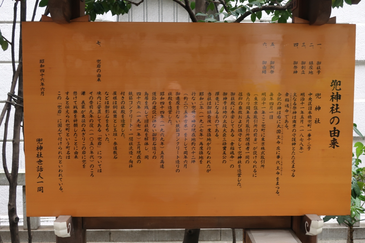 東京証券取引所と道を挟んで反対側の日本橋川沿いにある小さな神社が兜神社です。境内には鳥居と祠と兜岩があるだけですが、この神社の氏子総代は何と東京証券取引所。証券界の守り神として景気が良くなるようお参りする人がチョコチョコとおられました。