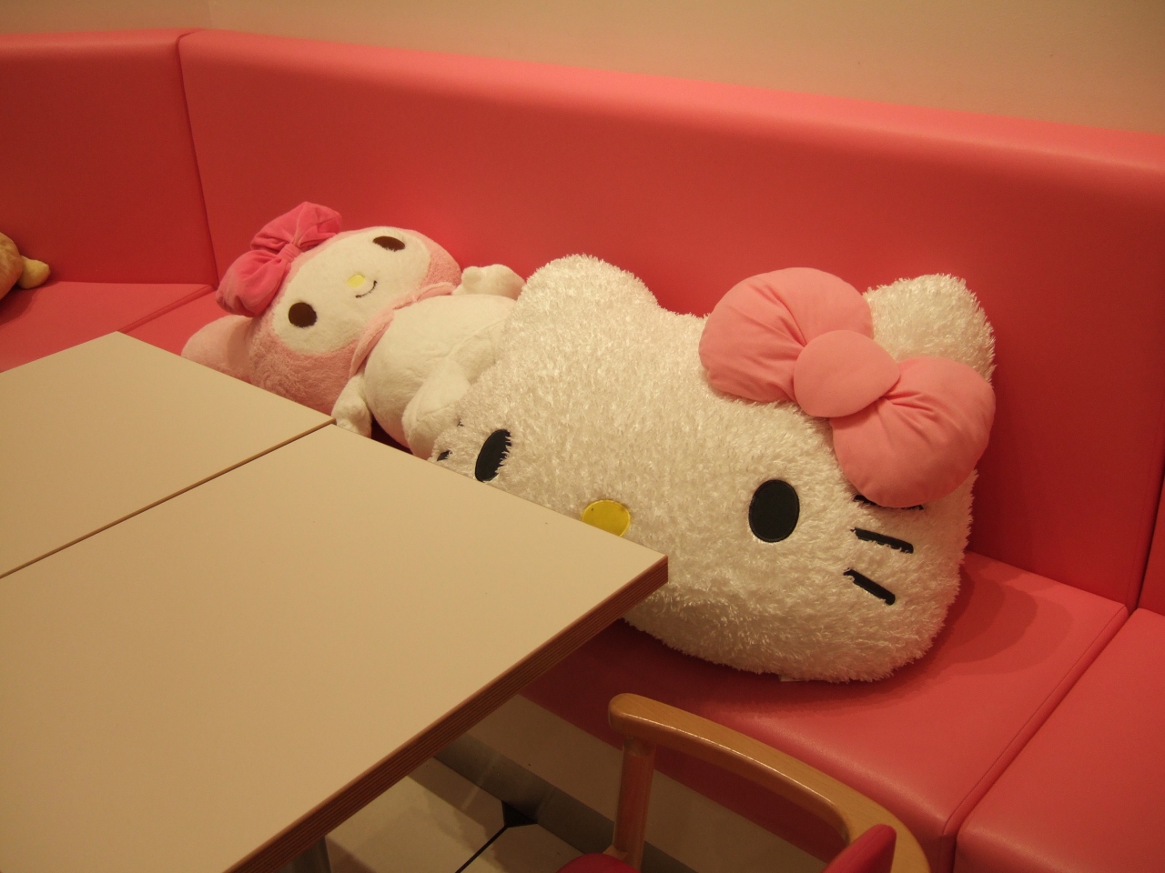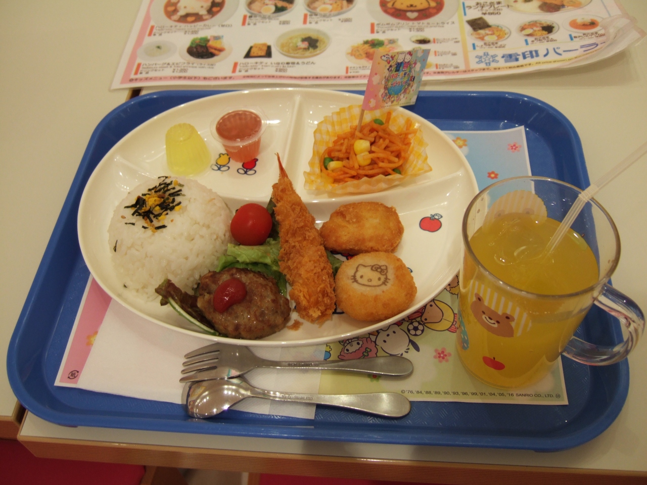 子供を遊ばせているとお腹が空いたと言うのでカフェに入ってみました。 店内はサンリオキャラクターのクッションなどが置いてあります。 お子様ランチは普通の内容ですが、クレジットカードも使えました。