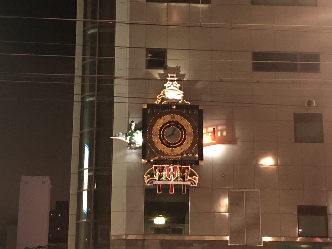20時ちょうどだったので、動くタイミングを逃さず初めから終わりまで見れました。大きな通りなので車もよく通りましたが、音も聞こえるし装飾も見えるし、時計の真下まで行かなくても大丈夫でした。